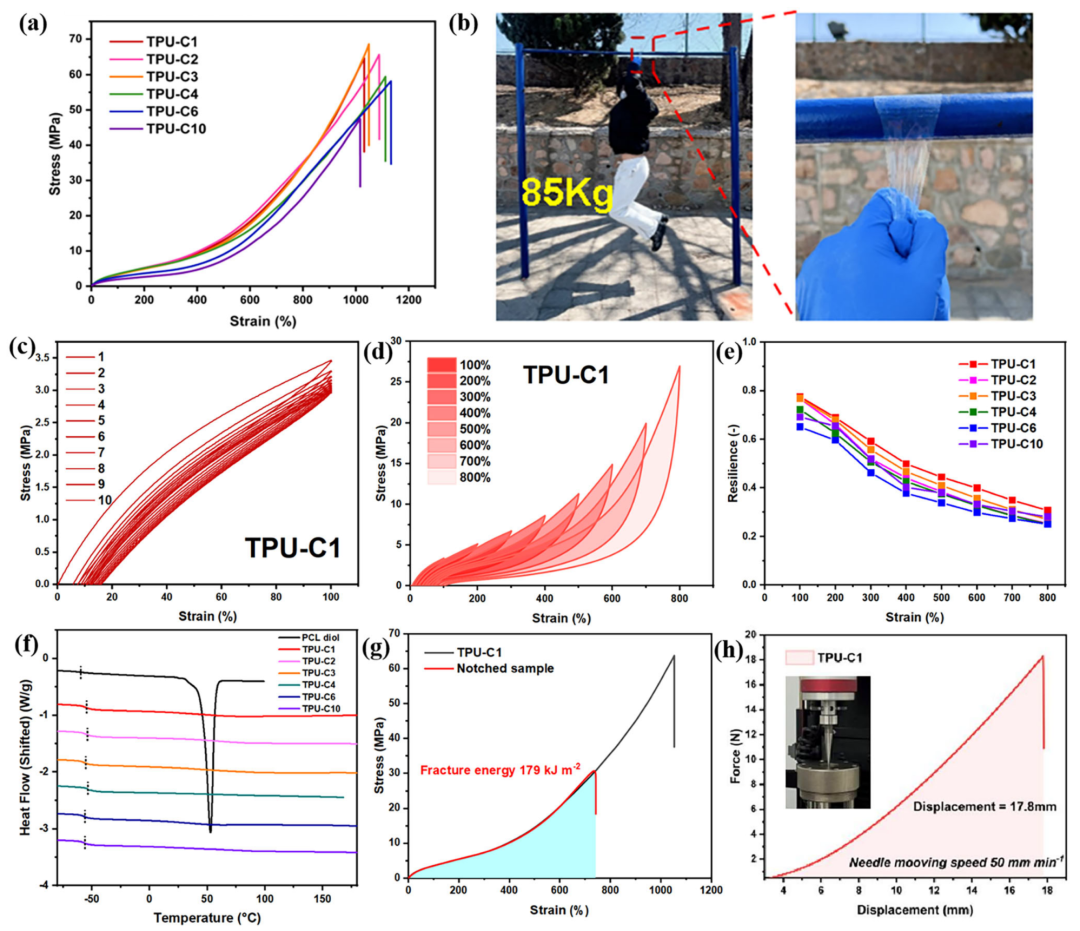 图3 a) TPU-C1至TPU-C10弹性体的单轴拉伸应力-应变曲线。 b) 宽度5 cm、厚度0.1 cm的TPU-C1弹性体薄膜承载85 kg重物的照片。 c) TPU-C1在100%固定最大应变下的典型循环拉伸曲线。 d) TPU-C1在100%至800%步进应变下的循环拉伸曲线。 e) 步进应变测试中TPU-C1至TPU-C10的回弹性随应变变化曲线。 f) TPU-C1至TPU-C10的DSC首次升温曲线(黑色实线为半结晶PCL二醇;竖虚线标记样品中软段PCL嵌段的玻璃化转变温度)。 g) 完整与带缺口TPU-C1样品的拉伸曲线对比(按Greensmith法计算断裂能)。 h) TPU-C1抗穿刺测试的力-位移曲线(插图为测试照片:厚度0.35 mm薄膜被钝头针以50 mm/min速度穿刺)。