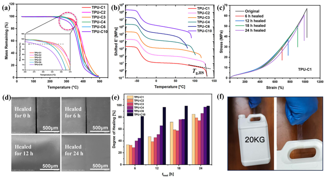 图5 a) TPU-C1至TPU-C10的热重分析(TGA)曲线。 b) DMA测试的储能模量(E′)曲线(TPU-C1至TPU-C10曲线依次上移10倍; Tg,HS由平台区与下降区外推斜率交点确定)。 c) TPU-C1原始样品与85°C不同修复时间( theal)后的应力-应变曲线。 d) TPU-C1薄膜切口修复过程的SEM图像(左上:未修复;右上:85°C修复6 h;左下:12 h;右下:24 h)。 e) TPU弹性体在不同 t heal t heal 下的修复度(基于韧性恢复率)。 f) 修复后TPU-C1薄膜(0.8 g)提起20 kg溶剂桶的照片(承载自重25000倍)。