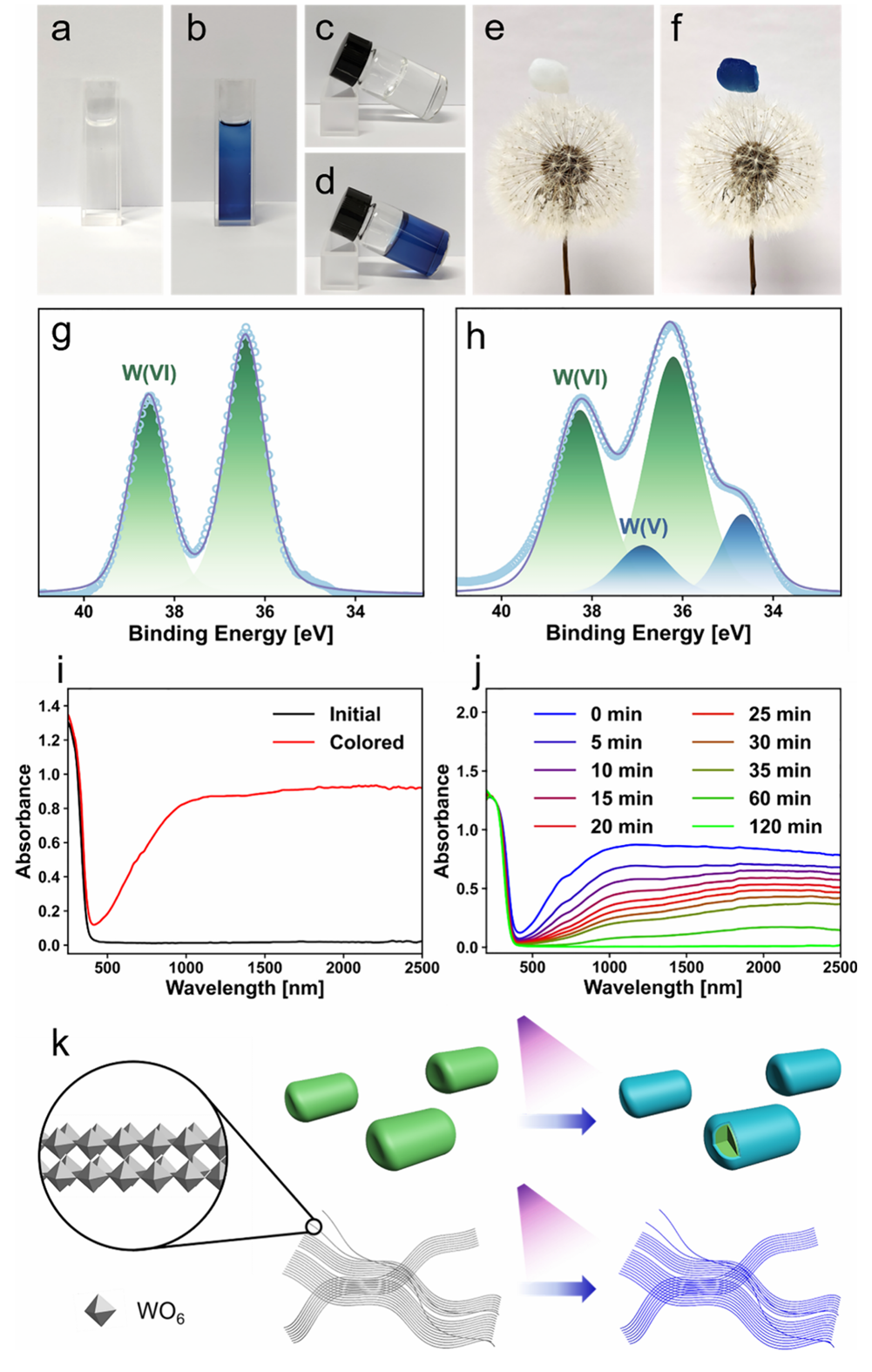 图3. TOSNWs光致变色性能 (a,b) TOSNWs乙醇分散液(5 mg·mL⁻¹)变色前后状态。 (c,d) TOSNWs凝胶(5 mg·mL⁻¹, V乙醇:V辛烷=1:1)变色前后状态。 (e,f) TOSNWs气凝胶变色前后状态。 (g,h) 初始态与变色态TOSNWs的XPS谱图(W 4f轨道)。 (i) 变色前后紫外-可见-近红外吸收光谱对比。 (j) 光照后不同时间点的吸收光谱变化(0-120分钟)。 (k) 亚纳米线(SNWs)与传统纳米颗粒光致变色机制对比示意图。