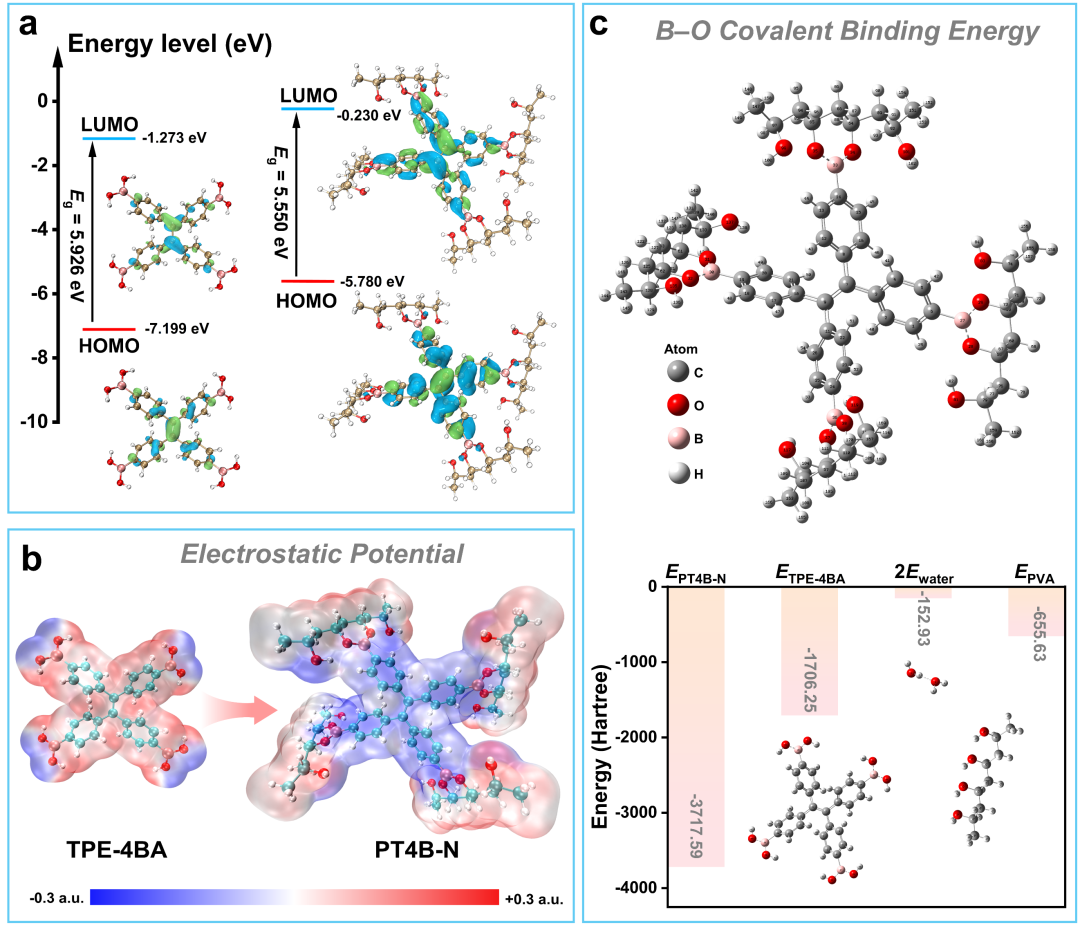 近期,福州大学功能高分子工程技术研究所林腾飞副教授团队联合福州大学附属省立医院麻醉医学中心郑晓春教授团队,受海洋生物行为的启发,设计了一种基于共价交联实现高效荧光的仿生软体致动器(图1)。致动器由双层水凝胶构成:发光层PT4B-N通过冻融法形成,其中TPE-4BA与聚乙烯醇(PVA)发生共价交联;驱动层PNPC采用光引发聚合法形成,主要成分包括PT4B-N和聚丙烯酸(PAAc)。值得注意的是,发光层以共价交联结合荧光分子,实现了高光致发光量子产率(PLQY > 60%)。作者构建了不同类型的四苯乙烯(TPE)分子模型用以进一步分析,结合密度泛函理论(DFT)计算和相互作用区域指示函数(IRI),揭示了其高亮度荧光现象源自于分子内旋转与振动受限效应,这一结果在实际中得到了验证(图2,图3)。