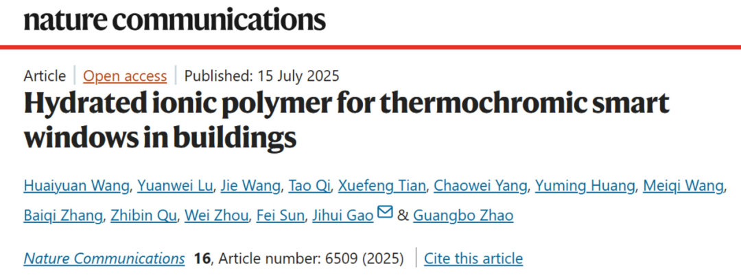 Wang Huaiyuan, Lu Yuanwei, Wang Jie, Qi Tao, Tian Xuefeng, Yang Chaowei, Huang Yuming, Wang Meiqi, Zhang Baiqi, Qu Zhibin, Zhou Wei, Sun Fei, Gao Jihui*, and Zhao Guangbo. Hydrated ionic polymer for thermochromic smart windows in buildings. Nature Communications, 2025, 16(1): 6509.