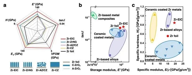 类牙釉质陶瓷层强化后的Zr foil兼具高刚度(121.3 GPa)和高阻尼(0.038),粘弹性品质因子达到了4.6 GPa,是传统工程材料(0.6 GPa)的7.6倍;同时具有优异的比模量(19.4GPa/(g/cm3))和比硬度(0.85 GPa/(g/cm3)),表明通过轻量化的强化策略能够同步提升金属的模量和硬度。