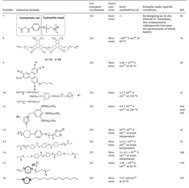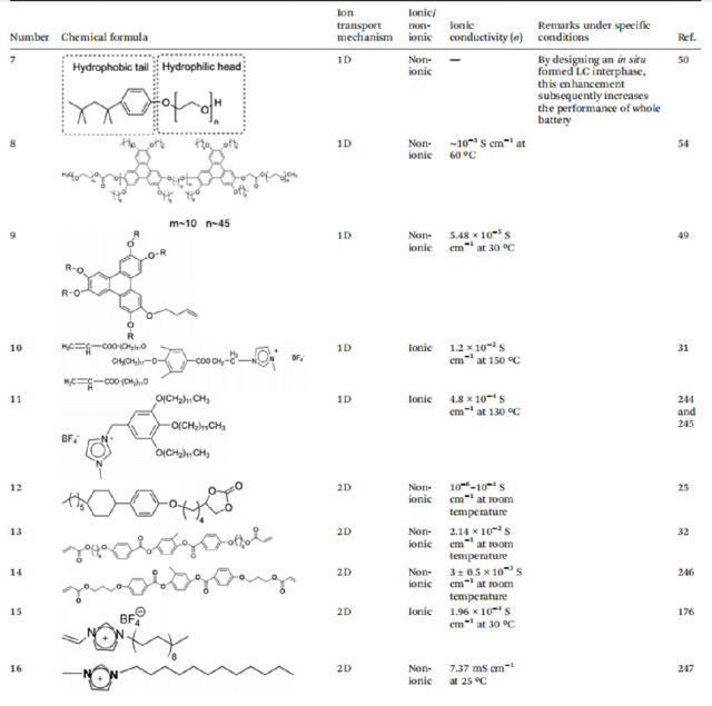 图1 液晶电解质(LCE)发展史上的几个关键点。首次合成液晶电解质。首次在类似固体的液晶电解质中展示离子传导。液晶电解质的交联有机双层结构。结合离子和电子功能的纳米结构液晶电解质。具有高度有序离子通道的向列型液晶电解质。首次将热致液晶用作电解质。盘状液晶电解质的自组装。首次将热致液晶用于锂离子电池。用于固态电池的具有有序快速锂离子传导纳米通道的柔性液晶电解质。具有纳米晶的固态刚性棒液晶电解质。快速离子传导的液晶分子改性共聚物。首次用于锂离子电池的液晶电解质。