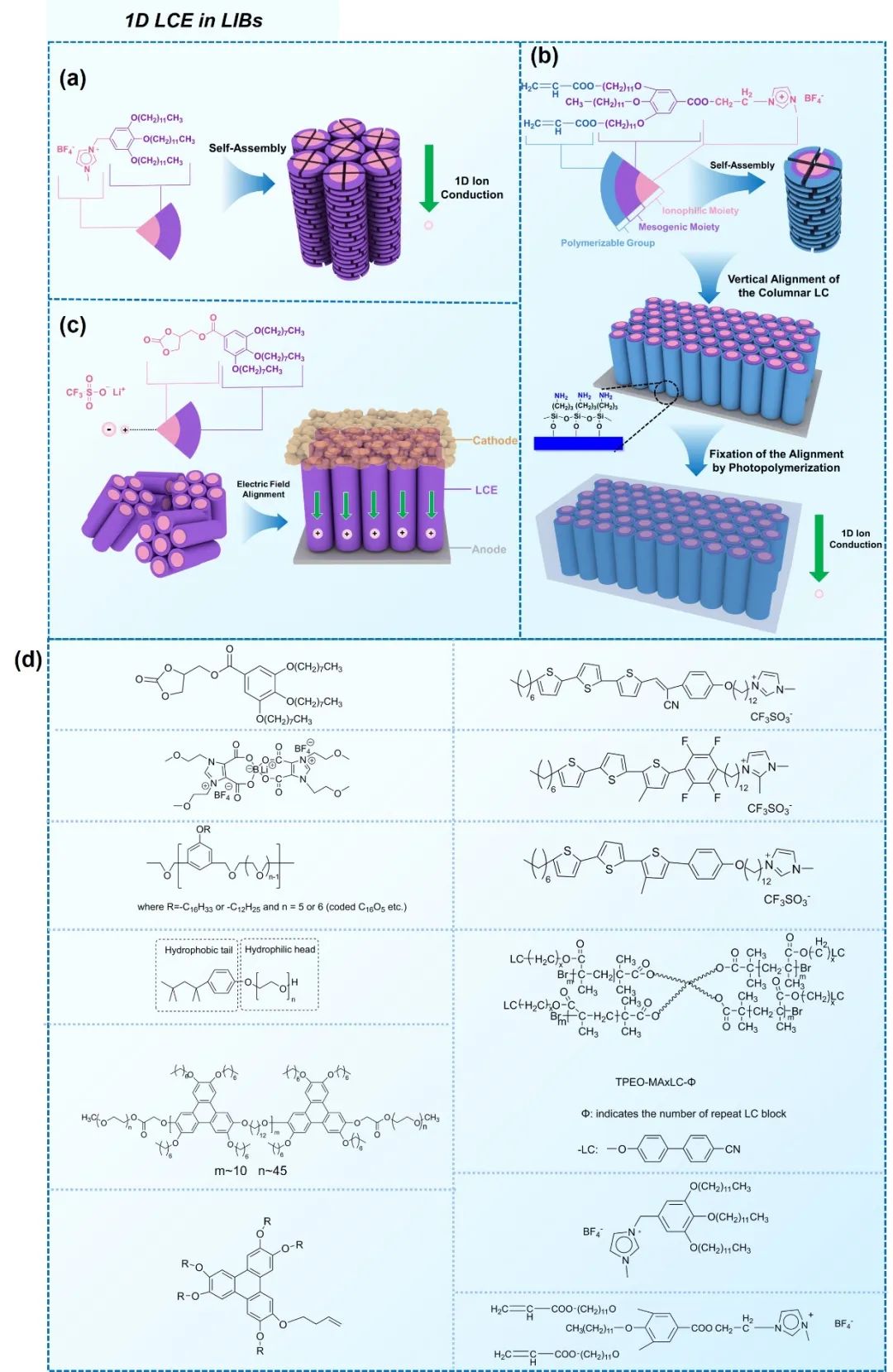 液晶(LC)凭借其独特的各向异性特性,赋予液晶电解质(LCE)在锂离子传输方面独特的机制。具体来说,LCE的自组装行为导致了柱状、层状和双连续立方相等纳米结构的形成,这些结构提供了高度有序的通道以促进锂离子传导。这种有序性源于液晶分子的高度组织的空间排列,促进了纳米多孔通道的形成,显著提高了锂离子的传输速率和稳定性,在塑造锂电池的电化学性能中起着关键作用。
