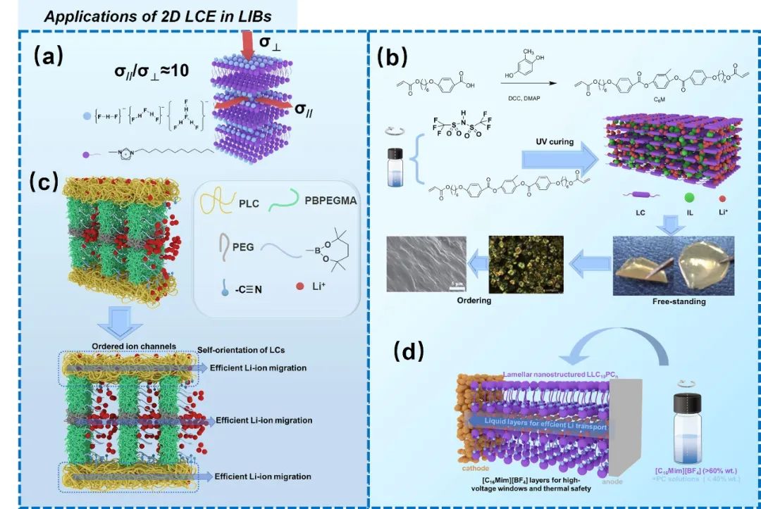 图6 二维液晶电解质在锂离子电池的机理图及实例