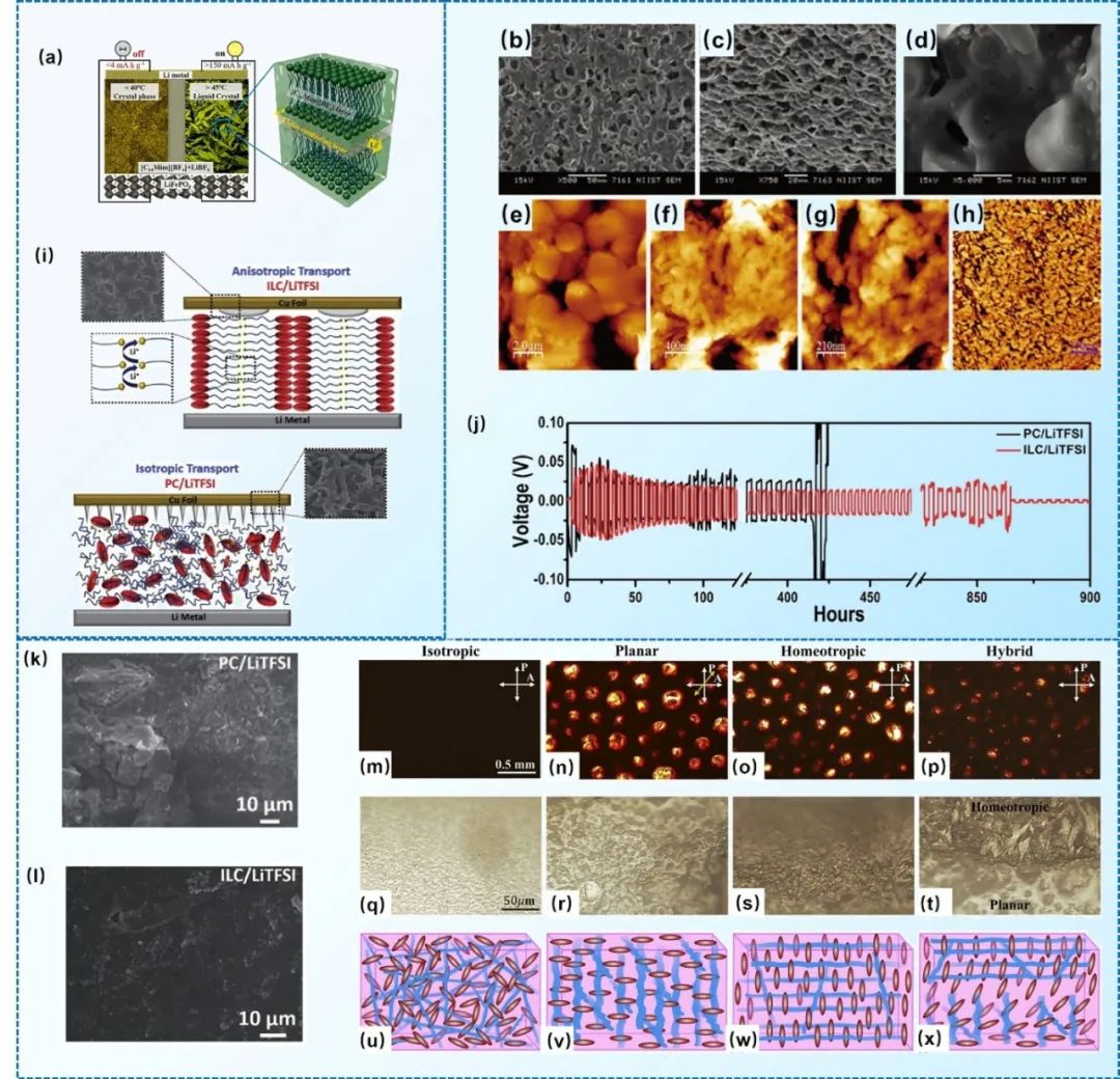 图10 (a) 基于层状纳米结构离子液晶的固态电解质(SSEs)用于具有热开关性能的LIBs。(a) (b) MIM-3的正面和(c)侧面扫描电子显微镜图像,显示有序的微孔结构。(d) 放大后的MIM-3扫描电子显微镜图像,展示了沿孔壁的纳米通道。(e) 原子力显微镜(AFM)下的微孔结构,(f),(g) MIM-3的放大原子力显微镜图像。(h) MIM-3的相位图像,显示出有效的电荷传输特性的定向表面。通过改变PMIMP和P(VDF-HFP)的组成制备了离子LEC,并分别命名为MIM-1、MIM-2、MIM-3和MIM-4。 (b)-(g)经Wiley-VCH许可转载。版权2017,Wiley-VCH。(i) 提出的各向异性锂质量传输效应抑制枝晶机制与各向同性传输相比的示意图。(j) 对称Li|ILC/LITFSI|Li和Li|PC/LiTFSI|Li电池在电流密度为0.1 mA cm-2时的电化学锂镀/剥离;循环后Li电极的后分析(FE-SEM):k) PC/LiTFSI和l) ILC/LITFSI电池。离子液晶表示为ILCs 30。(i)-(l) 经The Royal Society of Chemistry许可转载。版权2021,The Royal Society of Chemistry。(m)-(x) 各向同性、平面、垂直和混合样品(从左到右第一至第四列)的POM图像和结构示意图。上排:在交叉偏振光下iLCEs的顶部视图(所有四种纹理的比例尺在m)中显示)。中排:iLCEs的反射模式截面(图像厚度从底部到顶部)。下排:LCE(棕色椭圆)和相应样品的离子通道(蓝色线)的侧视图结构示意图。(m)-(x) 经AIP Publishing许可转载。