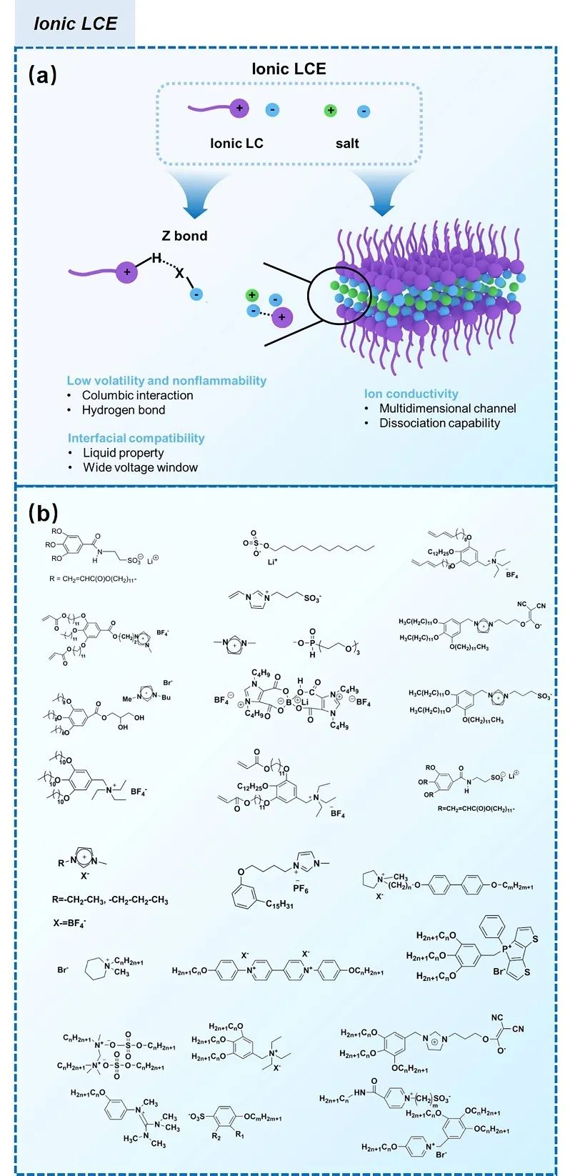 图9 (a) 离子型液晶电解质结构示意图及其储能优势。(b) 离子性液晶分子式总结。