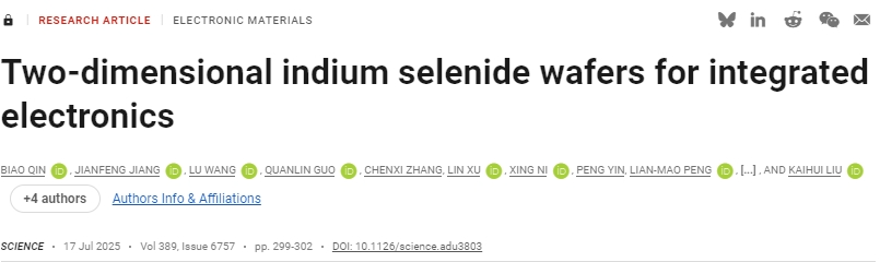 北京大学刘开辉教授团队开发了一种固-液-固(SLS)生长策略,成功制备出5厘米(2英寸)晶圆级高质量二维硒化铟(InSe)半导体薄膜。通过精确控制铟(In)与硒(Se)的1:1化学计量比,并利用液态铟界面促进非晶薄膜向单晶转化,解决了传统方法中相纯度低、结晶性差的难题。基于该材料,团队构建了大规模集成晶体管阵列,其电学性能全面超越现有硅基及二维薄膜器件。这也是国际上迄今能效最高的集成二维晶体管,标志着我国在新一代高性能芯片材料研究方面取得了里程碑式突破。相关成果于北京时间 7 月 18 日 以“Two-dimensional indium selenide wafers for integrated electronics” 为题发表于Science期刊。论文通讯作者为北京大学刘开辉教授、姜建峰博士、邱晨光研究员和中国人民大学刘灿副教授,第一作者为秦彪,姜建峰博士。 材料生长突破: 提出 SLS生长机制:在550°C高温下,通过液态铟密封反应室,形成富铟液相界面,驱动非晶InSe溶解-再结晶,实现高纯度、全晶圆单相InSe薄膜(厚度2.5–30 nm)。 攻克相纯度控制:避免In-Se系统中In2Se3等杂相生成,确保化学计量比严格为1:1。 器件设计创新: 采用钇(Y)掺杂电极抑制费米能级钉扎,实现超低接触电阻。 设计高效双栅结构,结合2.6 nm HfO2介电层,显著提升栅控效率。 材料特性: 亚阈值摆幅(SS):平均67.3 mV/dec,接近玻尔兹曼极限(60 mV/dec)。 导通电流密度:892 μA/μm(Vds=3 V,栅极长度480 nm),远超同类器件。 10 nm短沟道器件: 弹道输运率:78%,电流密度达1.2 mA/μm(@V<sub>DS</sub>=0.8 V)。 能效突破:延迟0.39 ps,能量延迟积(EDP)低至5.27×10-29 J·s/μm,超越2037年硅基技术预测极限。 综合优势: 在电压、栅长、DIBL、有效质量、开关比、弹道率六项指标上全面优于Intel 3 nm节点技术。 图1:InSe晶片生长的SLS策略设计 图2:InSe薄膜的特性 图3:二维InSe FET的晶圆级制造和电性能统计。 图4:InSe FET的短沟道电性能和基准测试 论文地址: https://www.science.org/doi/10.1126/science.adu3803