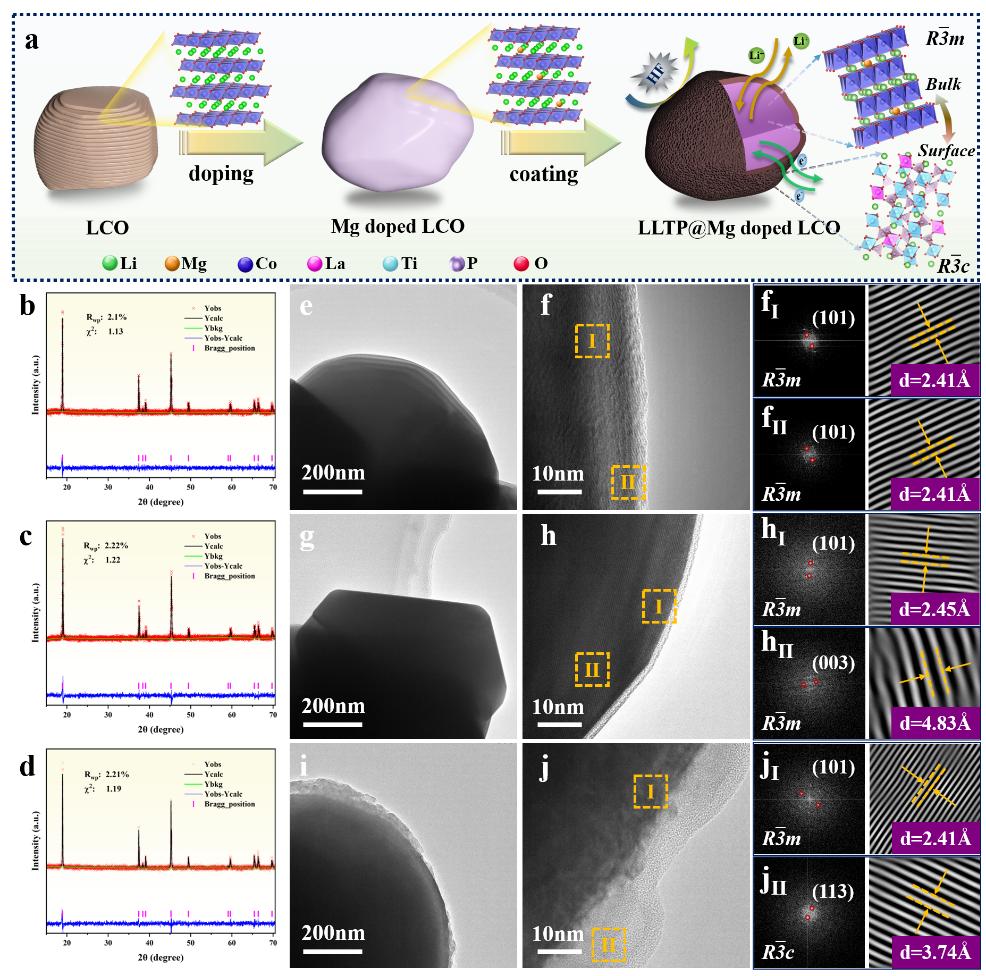 图1、(a)LLTP@Mg-doped LCO样品合成过程示意图;(b)LCO、(c)Mg-doped LCO和(d)LLTP@Mg-doped LCO的 Rietveld 精修结果;(e,f)LCO、(g,h)Mg-doped LCO 以及(i,j)LLTP@Mg-doped LCO的TEM和HRTEM图像,其中(f-j)对应区域 I 和 II 的 FFT 图谱。