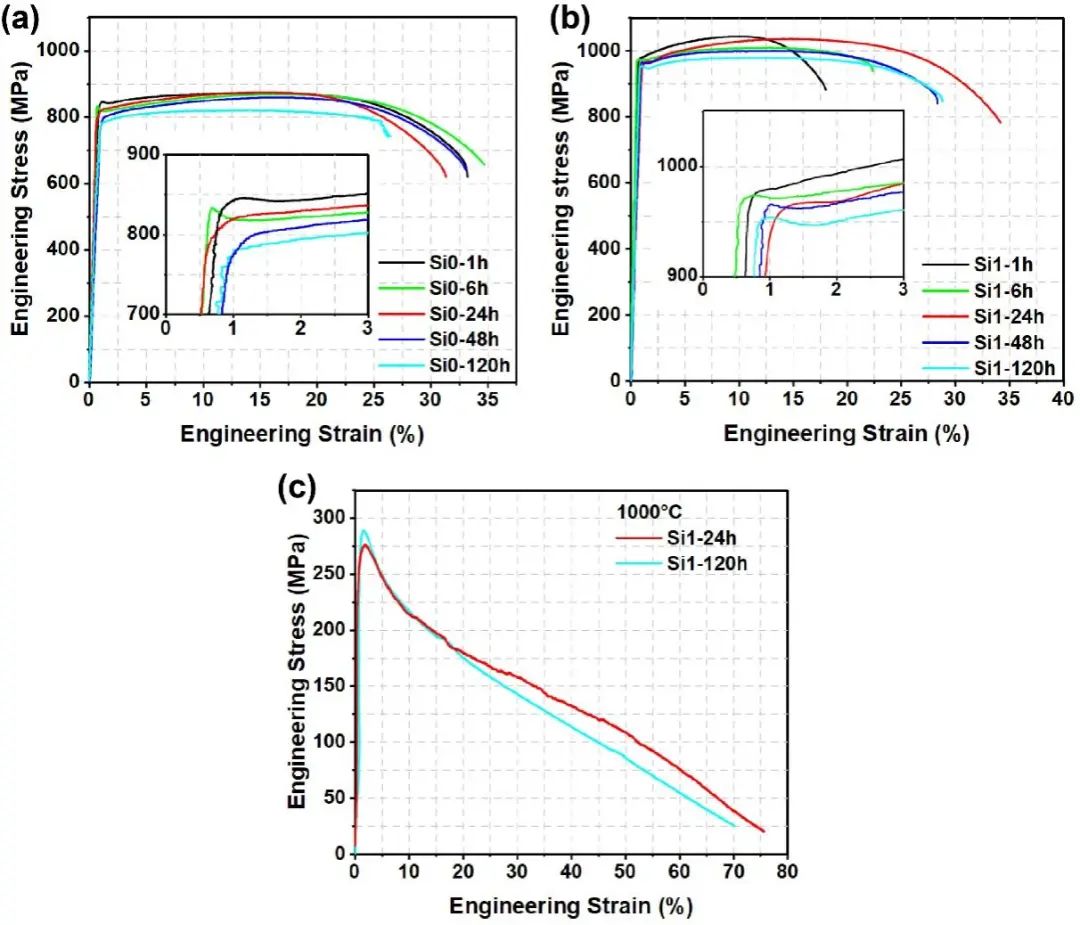 图5 (a, b)Si0-H-R和Si1-H-R在不同退火时间下的室温拉伸曲线;(c)Si1-H-R在1000°C下退火24 h和120 h后在1000°C下的拉伸曲线