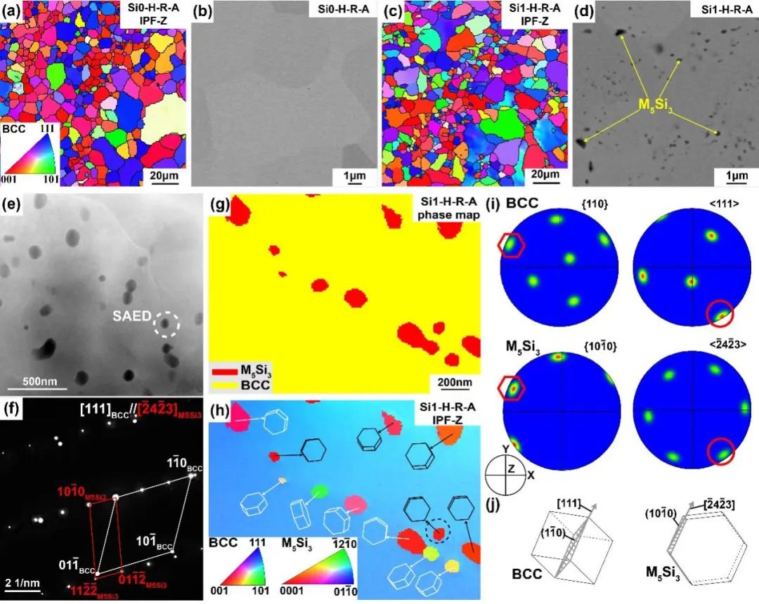 为探究纳米硅化物对强塑性的协同增益,研究对比了单相合金(Si0-H-R-A)与纳米硅化物强化合金(Si1-H-R-A)的微观结构与力学性能(图1、图2)。通过图2中对断后组织的GND分析,纳米硅化物显著阻碍位错运动,显著提升Si1-H-R-A的加工硬化能力。