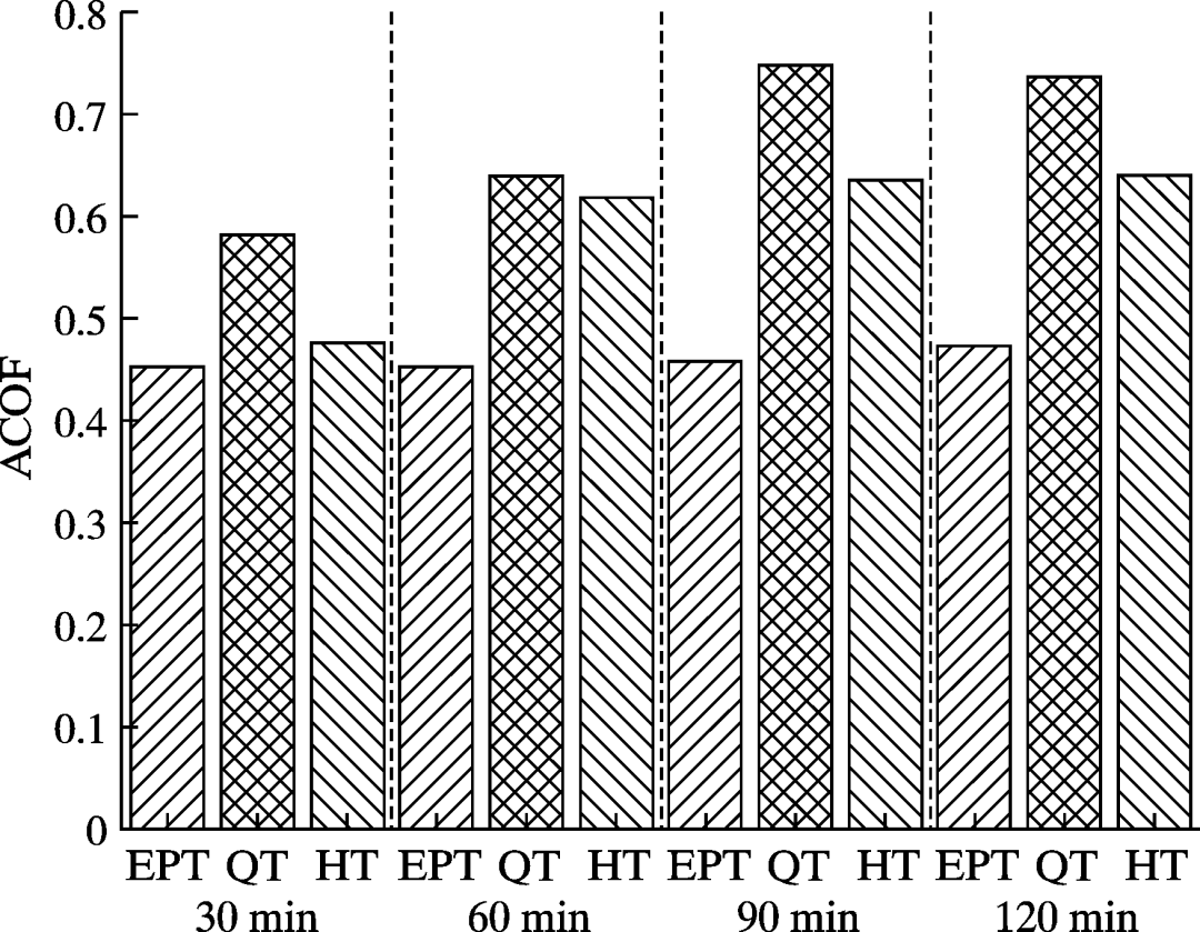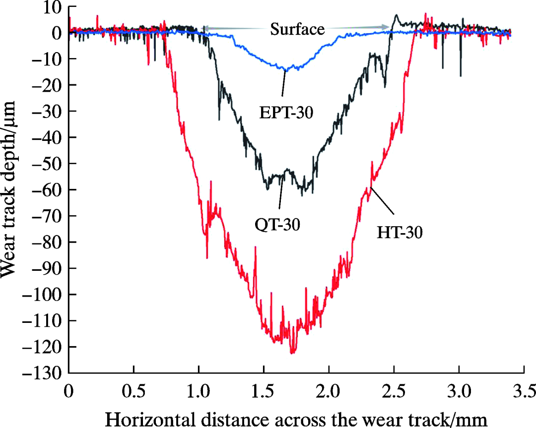 EPT试样的摩擦系数几乎全时间段均低于QT和HT,随着时间的延长摩擦系数增长幅度也小于HT和QT的。相较于HT和QT的磨痕体积,EPT试样的磨痕体积分别降低了91.98%、87.22%。