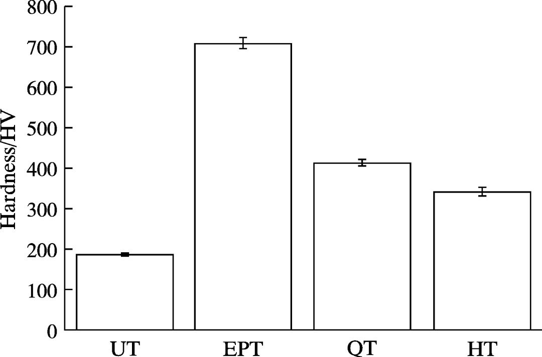 退火态UT试样显微硬度为186.2 HV,经QT处理后试样硬度为411.9 HV,在淬火后经过两次回火处理后试样的硬度为341.6 HV,经过EPT处理后试样显微硬度为708.2 HV,较UT试样提高了280.3%
