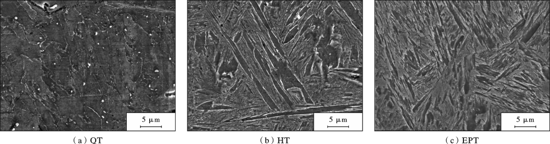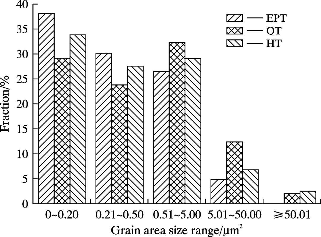 QT、HT和EPT试样的微观组织均以马氏体为主,HT处理试样的平均晶粒尺寸为149.31 μm2,QT处理试样的平均晶粒尺寸为62.49 μm2,EPT试样具有更加细小的平均晶粒尺寸22.6 μm2,这得益于脉冲电流的焦耳热效应和非热效应共同作用的效果。