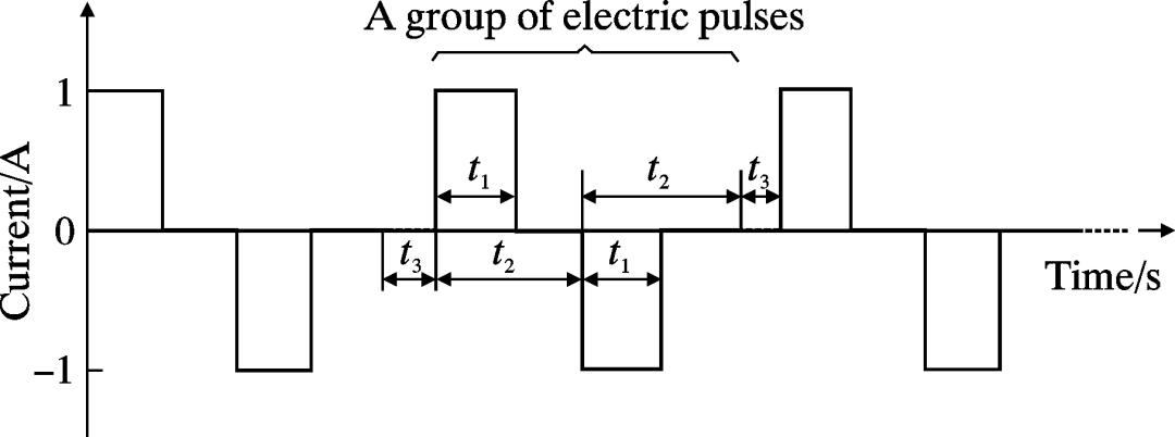 脉冲电流处理波形(t1是脉冲宽度,t2是1个脉冲周期的时间,t3是2组电脉冲之间的间隔)