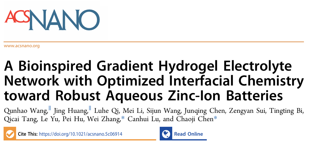 武汉大学陈超吉教授、四川大学张伟副研究员合作受关节软骨梯度结构启发,成功开发出新型梯度网络水凝胶电解质(图1)。该材料由两层功能化结构组成:阴极侧采用低密度聚乙烯醇/纤维素纳米纤维(PVA/CNF)层,其大孔道与高含水量加速离子传输;阳极界面则为高密度PVA/CNF/氧化石墨烯(GO)层,丰富的羧基/羟基官能团促进Zn²⁺脱溶剂化、降低水活性,GO的介电特性还提升了Zn²⁺迁移数与离子电导率。这种仿生设计使锌对称电池在1 mA cm⁻²下稳定运行超2200小时,Zn-MnO₂全电池兼具高倍率性能与抗损伤能力。