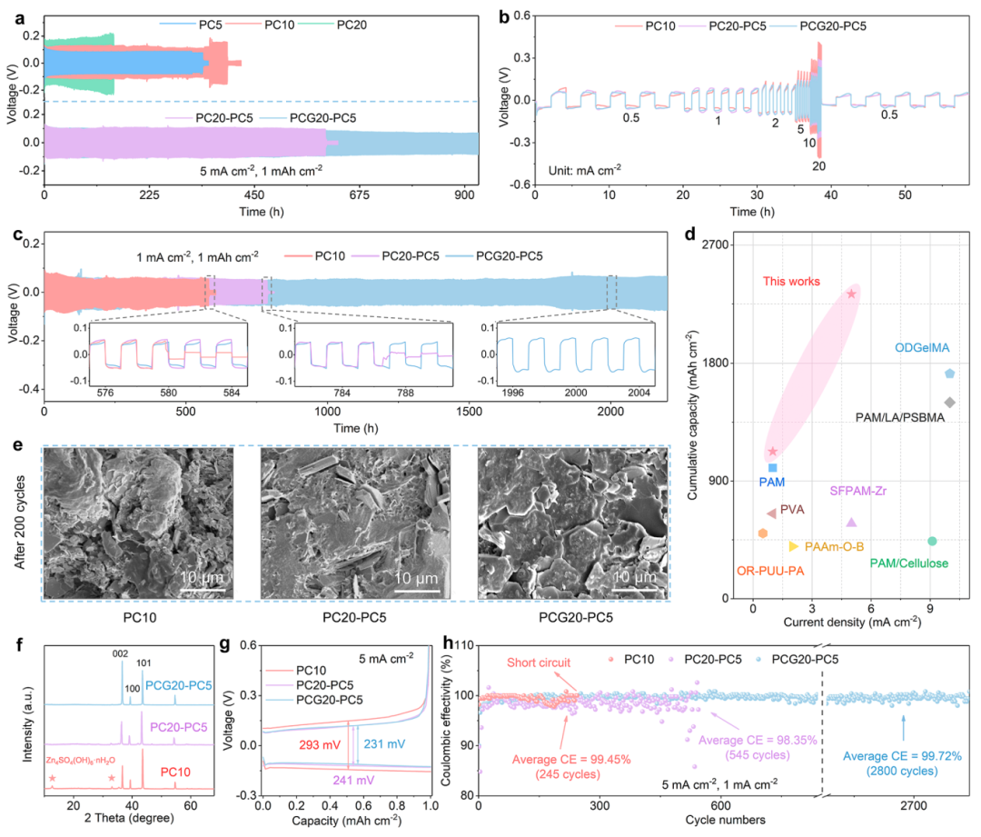 图3 展示锌阳极稳定性突破:PCG20-PC5组锌对称电池在5 mA cm⁻²下循环寿命达930小时(PC10组仅390小时),1 mA cm⁻²下更突破2200小时(图3c),性能优于近年报道的水凝胶体系。SEM显示循环后锌电极表面平整无枝晶,XRD未检测到副产物Zn₃SO₄(OH)₆·H₂O。Zn-Cu电池经2800次循环后库仑效率仍保持99.72%。