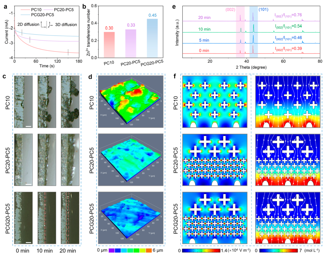 图4 解析沉积行为:恒电位测试表明梯度电解质将Zn²⁺扩散模式从2D平面转为3D均匀沉积;GO引入使Zn²⁺迁移数提升至0.45;原位显微成像显示PCG20-PC5组沉积层致密平坦,XRD证实(002)晶面择优生长,电场模拟验证其均匀化离子浓度场的能力。