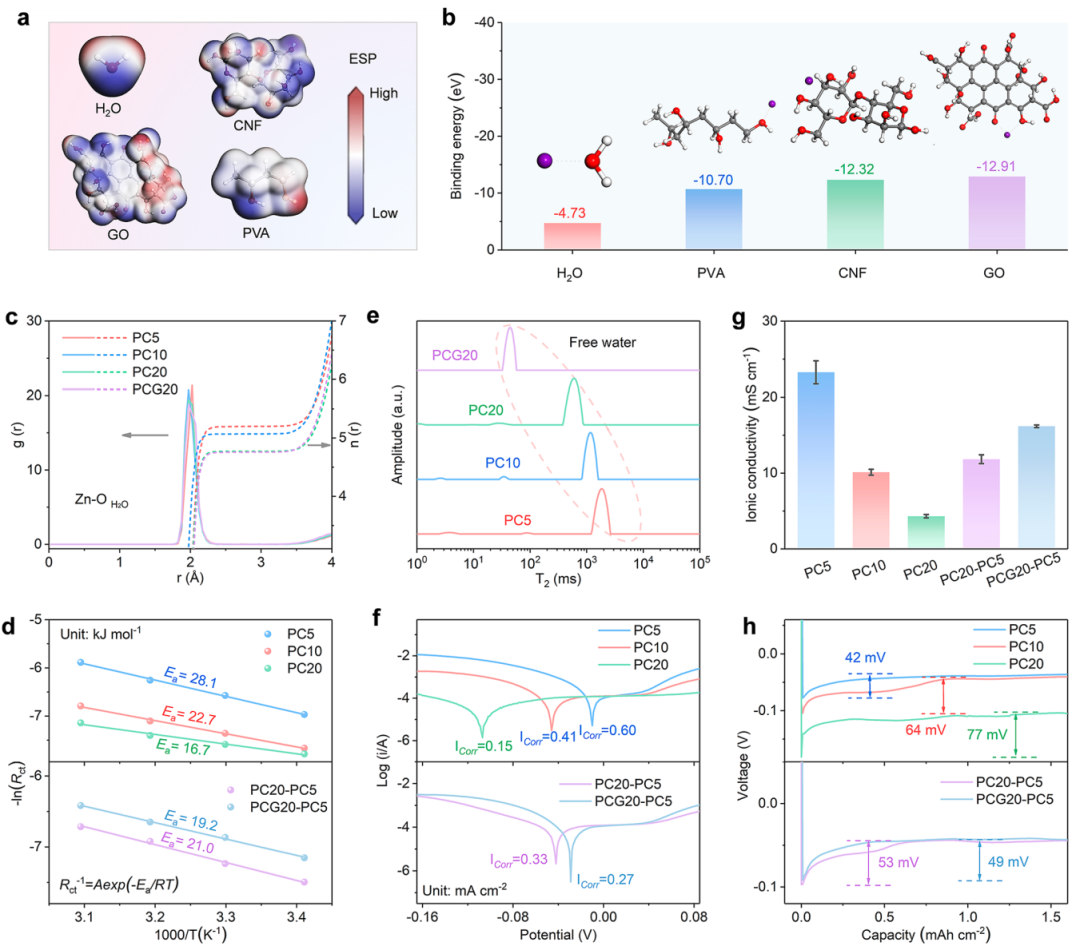 图2. 不同水凝胶电解质中Zn²⁺传输与沉积行为的理论模拟与表征 (a) H₂O、PVA、CNF和GO分子的静电势(ESP)分布图 (b) Zn²⁺与PVA、CNF及GO分子结合能的DFT计算 (c) PC5、PC10、PC20和PCG20水凝胶电解质的径向分布函数(RDFs)及Zn–O(H₂O)配位数 (d) 含不同水凝胶电解质的锌对称电池的Arrhenius曲线及脱溶剂化活化能值 (e) 水凝胶电解质的低场核磁共振(LF-NMR)曲线 (f) 含不同水凝胶电解质的锌对称电池的Tafel图 (g) PC5、PC10、PC20、PC20−PC5和PCG20−PC5水凝胶电解质的离子电导率 (h) 铜箔上Zn电镀的电压曲线(1 mA cm⁻²)