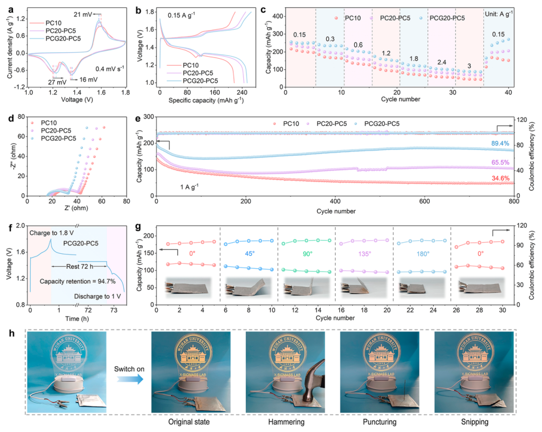 图5 验证全电池性能:PCG20-PC5组Zn-MnO₂电池在0.15 A g⁻¹下放电容量达250.6 mAh g⁻¹,800次循环后容量保持率99%(衰减率仅0.013%/次)。柔性软包电池弯折时容量几乎不变,即使经历锤击、穿刺、剪割等破坏仍能持续点亮LED灯(图5h),展现卓越安全性。