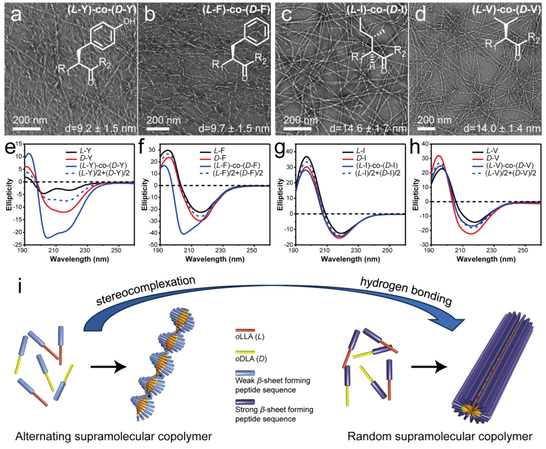 图4. 肽序列调控对共聚行为的影响 (a–d) (L-X)-co-(D-X) 共聚物的 TEM 图像(X 为肽序列 GVQXVYR 中的中央残基)。各图右上角标注 X 残基的化学结构。 (e–h) 对应 (a–d) 共聚体系的 CD 光谱(椭圆率单位:10⁴ deg·cm²·dmol⁻¹)。 (i) 立体络合作用(左)与氢键作用(右)分别主导交替型与无规型超分子共聚的示意图。