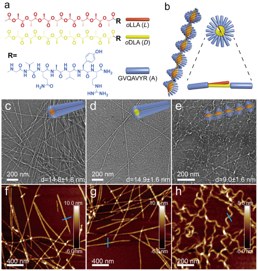图1. 分子设计与形貌表征 (a) 寡聚(L-乳酸) (oLLA, L, 红色)、寡聚(D-乳酸) (oDLA, D, 黄色) 及肽序列 GVQAVYR (A, 蓝色) 的化学结构。 (b) 交替超分子共聚物 (L-A)-co-(D-A) 示意图。截面图展示交错双层堆叠模型。 (c) L-A 均聚物、(d) D-A 均聚物 和 (e) (L-A)-co-(D-A) 共聚物的 TEM 图像。 (f) L-A 均聚物、(g) D-A 均聚物 和 (h) (L-A)-co-(D-A) 共聚物的 AFM 图像。 样品条件:单一组分 L-A 或 D-A 浓度为 1 mM;L-A 与 D-A 混合体系摩尔比为 1:1,总浓度为 1 mM。