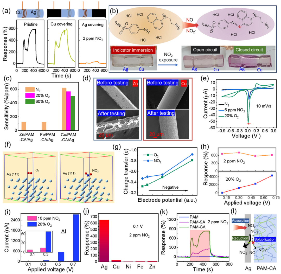 图3 自供电NO₂传感器的传感机制 a) 原始器件、覆盖Cu电极和Ag电极的器件对2 ppm NO₂的动态响应对比。 b) 浸渍显色剂(萘乙二胺盐酸盐/对氨基苯磺酰胺混合溶液)的PAM-CA水凝胶器件在开路/闭路模式下暴露5 ppm NO₂ 5分钟前后的颜色变化。 c) Zn/PAM-CA/Ag、Fe/PAM-CA/Ag和Cu/PAM-CA/Ag在N₂、20%和60% O₂中的灵敏度对比。 d) Zn/PAM-CA/Ag与Cu/PAM-CA/Ag中Zn/Cu电极在空气中测试10小时前后的SEM图像。 e) Cu/OPAM-CA/Ag在N₂、5 ppm NO₂和20% O₂中的循环伏安曲线。 f) O₂与NO₂分子在Ag(111)表面的吸附结构。 g) 不同电极电位下O₂/NO₂与Ag电极间的电荷转移数对比。 h) 不同偏压下Ag/PAM-CA/Ag对2 ppm NO₂和20% O₂的响应幅度对比。 i) 不同偏压下Ag/PAM-CA/Ag对2 ppm NO₂和20% O₂的响应电流对比。 j) 0.1 V偏压下Ag/PAM-CA/Ag、Cu/PAM-CA/Cu、Ni/PAM-CA/Ni、Fe/PAM-CA/Fe和Zn/PAM-CA/Zn对2 ppm NO₂的响应对比。 k) PAM、PAM-SA和PAM-CA基器件对2 ppm NO₂的动态响应曲线。 l) 致密PAM-CA调控Ag电极-凝胶界面NO₂反应路径的示意图:抑制NO₂溶解,促进电极还原反应,最终实现高灵敏度。