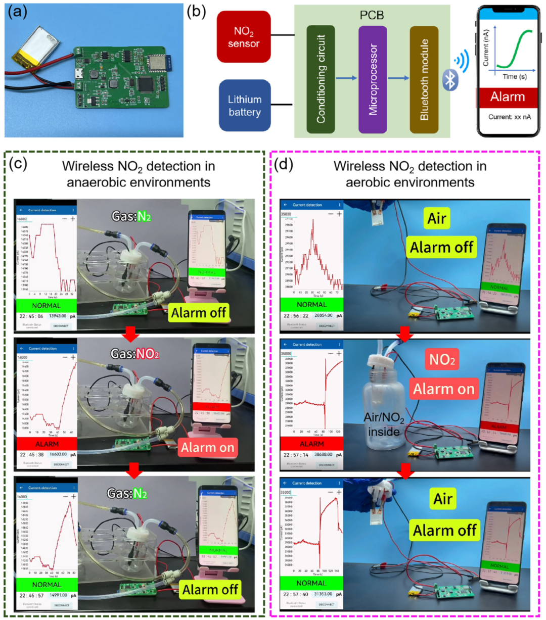 图4 自供电传感器在有氧/无氧环境中的无线NO₂监测 a) 自主设计PCB电路板的光学图像。 b) 无线NO₂泄漏报警系统组成示意图:NO₂传感器、电源、集成调理电路/微处理器/蓝牙模块的PCB、智能手机终端。 c) 无氧环境实时监测:当2 ppm NO₂/N₂通入测试瓶时触发报警,停止供气后解除。 d) 有氧环境实时监测:当器件从空气移入含痕量NO₂的测试瓶时触发报警,移回空气后解除。