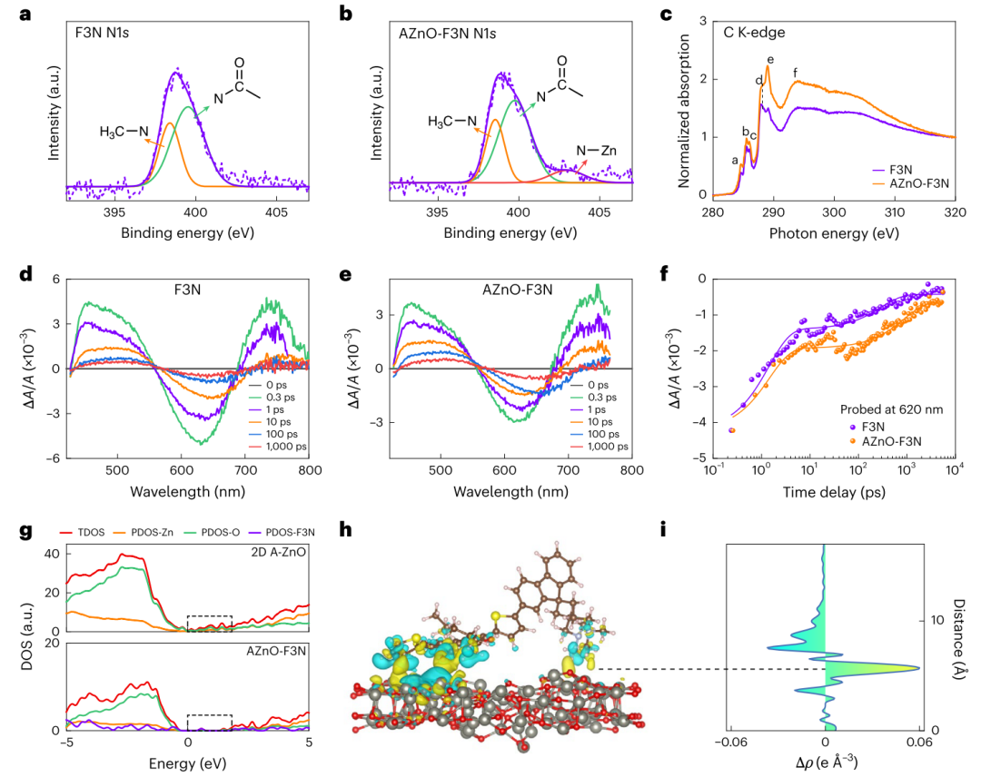 图3:F3N与2D A-ZnO的双组分协同效应 a,b. F3N(a)和AZnO-F3N(b)薄膜的N1s核心能级XPS及拟合谱 c. F3N和AZnO-F3N薄膜的碳K边软X射线吸收光谱 d,e. 400 nm激发下F3N(d)和AZnO-F3N(e)薄膜在指定延迟时间的瞬态吸收光谱(2D A-ZnO不吸收400 nm光子,仅F3N被激发) f. F3N和AZnO-F3N薄膜在620 nm处探测的瞬态吸收衰减动力学 g. 2D A-ZnO和AZnO-F3N的态密度(DOS)(价带顶能量设为零;PDOS:分波态密度;TDOS:总态密度) h. AZnO-F3N的优化结构及电荷密度差图示 i. AZnO-F3N在z坐标上的电荷位移分布(黄色/蓝色分别对应电子积累/耗尽)