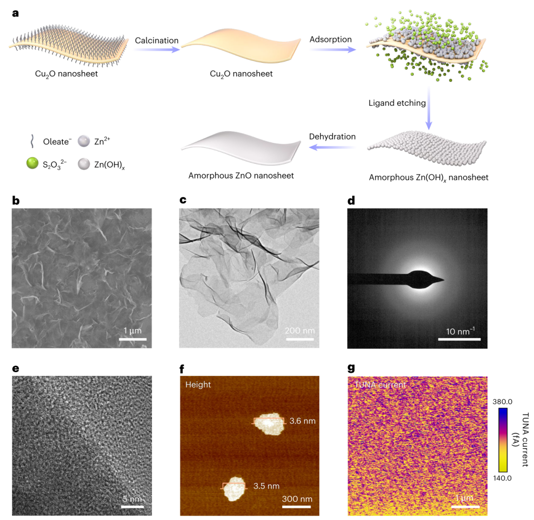 图1:二维非晶氧化锌(2D A-ZnO)的合成与表征 a. 超薄非晶氧化锌纳米片(2D A-ZnO)的合成路线示意图 b. 2D A-ZnO的扫描电子显微镜(SEM)图像 c, d. 透射电子显微镜(TEM)图像(c)及对应选区电子衍射图谱(d) e. 2D A-ZnO的X射线衍射图谱(插图为高分辨率TEM图像) f. 原子力显微镜(AFM)测得的纳米片高度(厚度约3.5 nm) g. 隧道电流原子力显微镜(TUNA)表征的2D A-ZnO表面电导率