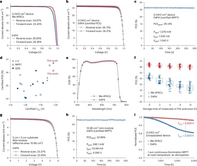 金属卤化物钙钛矿因卓越的光电特性而迅速提升了太阳能电池效率,但要逼近 Shockley–Queisser 极限仍受限于空穴选择性层(HSL)的均匀沉积与分子聚集问题。传统小分子 HSL(如 Me‑4PACz)在溶液工艺中易聚集,导致器件效率、可重复性与稳定性下降。行业急需能够在保持高黏附性的同时抑制分子团聚的新型有机空穴材料,以实现可规模化生产的高效钙钛矿电池。鉴于此,香港城市大学朱宗龙教授, 华中科技大学李忠安教授,香港城市大学曾晓成教授联合报道通过在钙钛矿成膜过程中协同沉积一种新型 p 型小分子 D4PA,其分子内 C–C 耦合不仅提供双位点锚定以强化界面电荷传输和缺陷钝化,还通过构象扭曲与位阻效应有效阻止分子聚集。小面积器件获得 26.72% 认证效率,10.86cm² 迷你组件亦达到 23.37% 效率;在最大功率点连续工作 2500h 后仍保持 97.2% 初始效率,展示了商业化连续工艺的可行性。相关研究成果以题为“High-efficiency perovskite solar cells enabled by suppressing intermolecular aggregation in hole-selective contacts”发表在最新一期《nature photonics》上。值得一提的是,这是朱宗龙教授自2022年以来,已发表三篇《Science》后,再发《nature photonics》。作者首先给出了 ITO/D4PA钙钛矿/C₆₀/BCP/Ag 反向结构示意(图1a);TOFSIMS 深剖表明 D4PA 由界面向体相均匀分布(图1b)。密度泛函计算显示,图1c、1d 中 D4PA 的双磷酸锚基在 ITO (111) 面形成 P–O–In 键长 2.29Å、结合能 −4.42eV,而在钙钛矿表面(图1f)则与 Pb²⁺ 协调。图1e 的半旋转能差证明分子内氢键仅在旋转角 <30° 时稳定,确保构象锁定并提供位阻。pDOS 分析(图1g、1h)显示磷氧对价带最大值有显著贡献,说明 2T 锚定促进界面电荷转移。整体来看,D4PA 同时实现了强黏附与防聚集双重功能。XPS(图2a)中 Pb 4f 峰向低束缚能移动表明 D4PA钙钛矿相互作用更强;温度依赖 FTIR(图2b、2c)显示 D4PA 的 P=O 振动在低温已完成红移,证明晶粒早期即形成稳定键合。XRD(图2d)峰强增强及峰面红外成像(图2e、2f)共同揭示 D4PA 促进膜内均匀分散并提高结晶度。DFT 计算(图2g)给出 D4PA 分子间结合能 −1.495eV,远弱于 Me4PACz 的 −2.356eV;DLS 结果(图2i)证实 12h 储存后前者颗粒仅由 62nm 增至 102nm,而后者从 211nm 增至 405nm,进一步印证位阻效应抑制聚集,为连续工艺延长“可加工窗口”。在 0.0412cm² 器件上,图3a 的 J–V 曲线显示 D4PA 反扫效率 26.83%,较 Me4PACz 提升 1.86pct;图3b 的认证曲线确认 PCE 为 26.72%,对应 VOC=1.197V、JSC=26.21mAcm⁻²、FF=85.17%。稳态功率跟踪(图3c)在 300s 内保持 26.14% 效率。图3f 进一步显示不同储存时间下 D4PA 墨水制备的器件效率仅下降 0.32%,而 Me4PACz 下降 1.81%,验证其工业友好性。刀片涂布的 10.86cm² 迷你组件(图3g、3h)实现 23.37% PCE 与 22.66% 认证 MPPT 效率;长期稳定性测试(图3i)中,D4PA 设备在空气中 1sun MPP 持续 2500h 后仍维持 97.2% 初始性能,优于对照组的 82.7%。激发光从 ITO 侧进入时,D4PA 薄膜的 PL 分布(图4b)均匀且整体强度降低,TRPL(图4c)载流子寿命缩短,说明空穴提取更快更均一。tDOS(图4d)显示 0.4–0.5V 深能级陷阱密度显著下降;QFLS光强曲线(图4e)下 D4PA 膜始终高于 Me4PACz,配合 15.25% 的 EQE_EL(图4f)反映界面非辐射复合被抑制。DFT 进一步揭示 D4PA 双位点锚定对 VI、i_I 与 Pb_I 缺陷区域(图4g–4i)具有 −2.75至 −3.37eV 的低结合能,且缺陷诱导态被完全钝化,为高 VOC 与低能损奠定基础。总的来说,分子内 C–C 耦合赋予的构象锁定与多位点锚定使 D4PA 同时实现了界面黏附增强、缺陷钝化与分子去聚集三重优势,在小面积器件中创造 26.72% 认证效率,并首次通过一步沉积在 10.86cm² 组件上取得 23.37% 的 PCE 与 2500h 的 MPP 稳定性。该策略为开发高效、可连续制备且长寿命的 p–i–n 钙钛矿太阳能电池提供了新路线,也为未来工业级大面积生产奠定了材料与工艺基础。