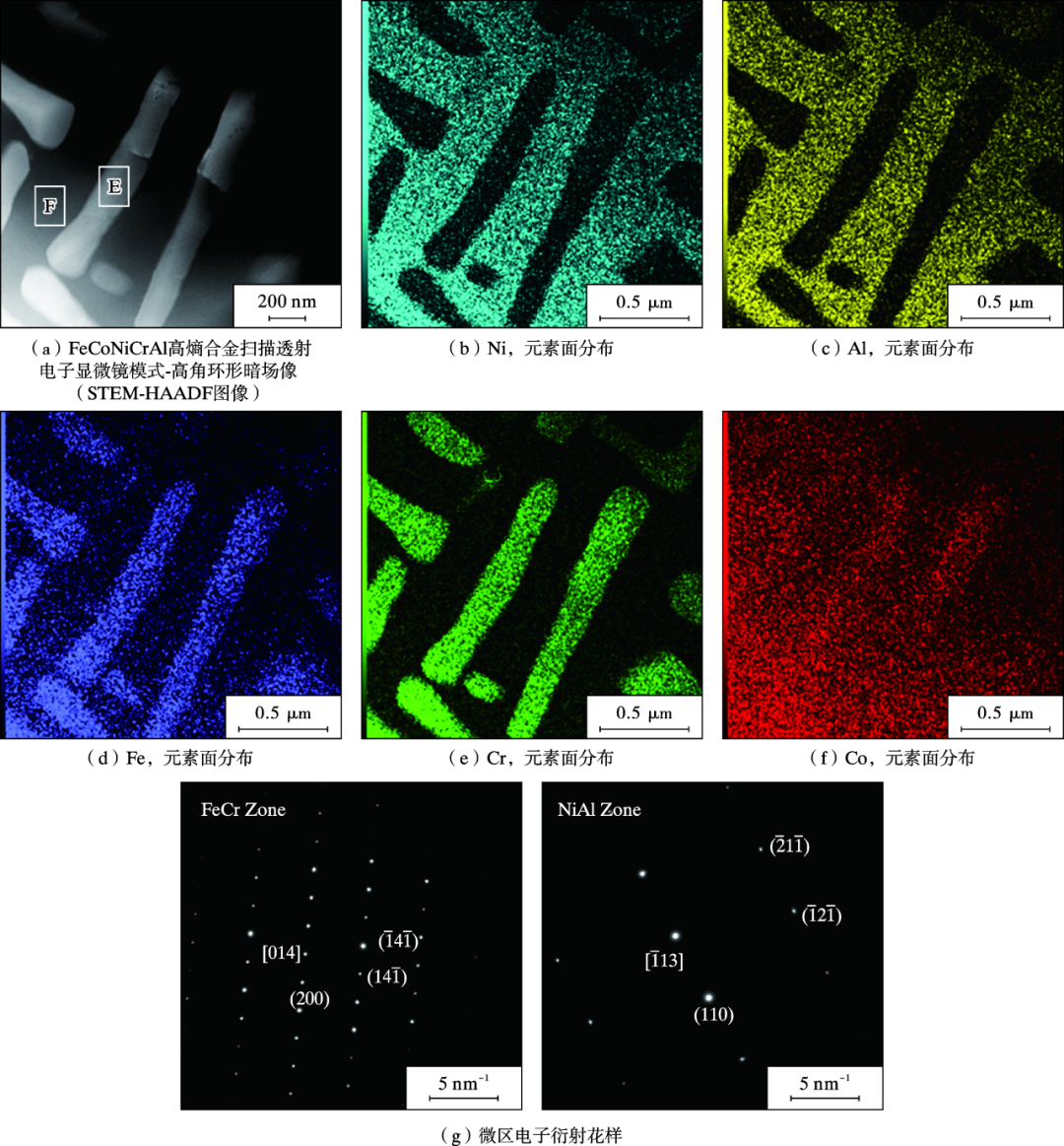 FeCoNiCrAl合金的STEM-HAADF图像、元素面分布及微区电子衍射花样