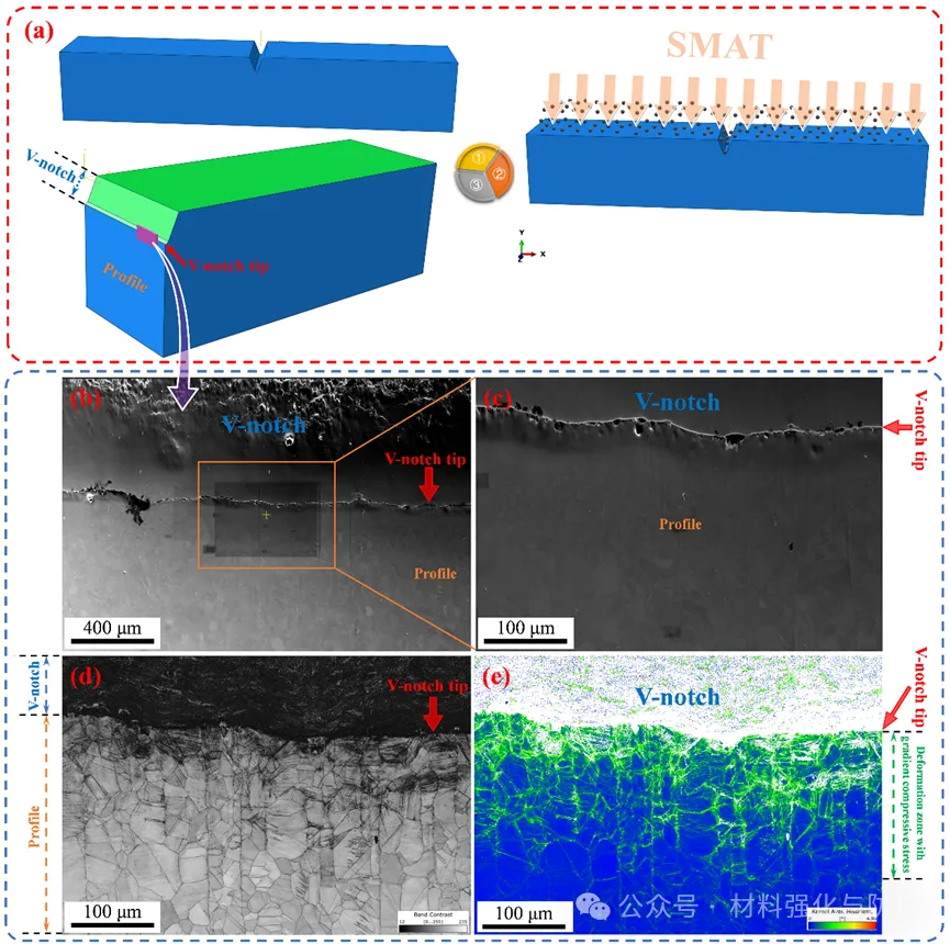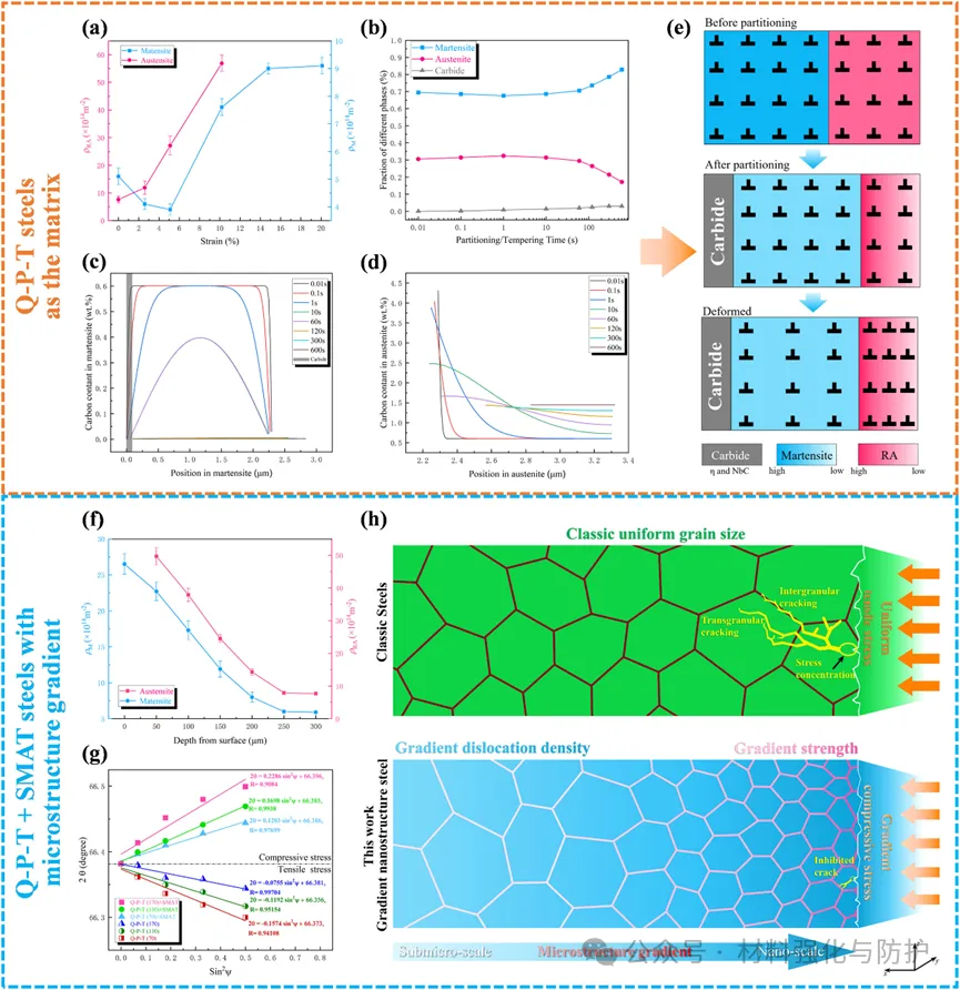研究通过DAMAI效应促进了位错跨马氏体/奥氏体界面迁移,减少了马氏体中位错的积累以增强变形能力,通过SMAT处理形成的微观结构梯度延缓了裂纹扩展并促进均匀变形,形成的残余压应力梯度抵消了缺口拉应力并降低裂纹驱动力。