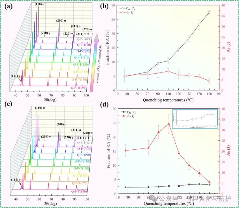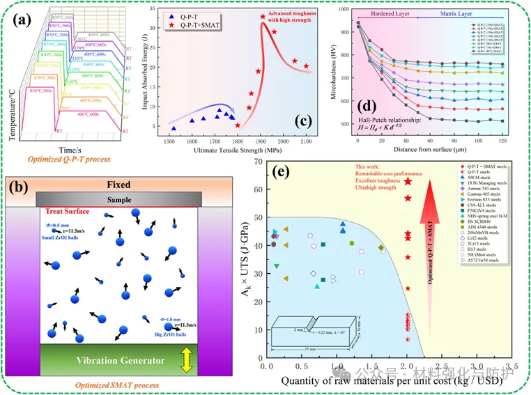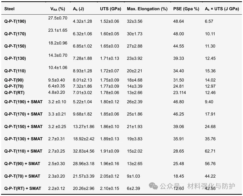 该研究利用了DAMAI效应和QPT-LE模型使钢中残余奥氏体含量优化到约10%,并通过细化碳颗粒提高了机械稳定性。另外作者使用表面机械研磨处理(SMAT)的方式让钢表面形成了残余压应力和微观结构梯度,增强了冲击时的能量吸收。结果使Q-P-T钢的冲击韧性提高了4倍,同时保持了UTS1.8~2.1GPa的高强度。
