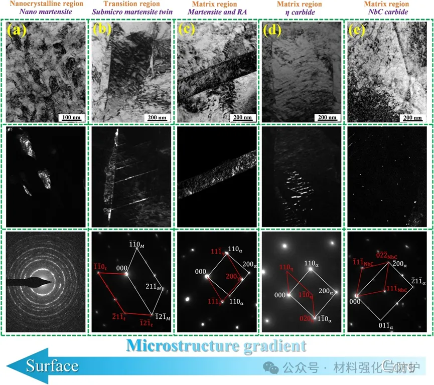 明场和暗场像以及选区电子衍射图:(a) 纳米马氏体,(b) 马氏体孪晶,(c) 马氏体板条与RA呈K-S取向关系,(d) Q-P-T (110) + SMAT钢中η碳化物和 (e) NbC碳化物