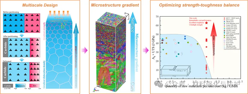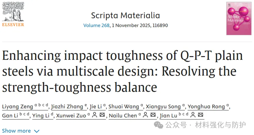 近日上海交通大学陈乃录研究员和香港城市大学吕坚院士团队提出了一种新的多尺度设计方法使Q-P-T钢的冲击韧性增加了4倍,不仅展示了多尺度设计在压应力梯度和组织梯度上优化钢性能的潜力,而且为高性能材料在动态载荷应用中提供了一种可扩展且经济的解决方案。相关研究结果以“Enhancing impact toughness of Q-P-T plain steels via multiscale design: Resolving the strength-toughness balance”为题发表在国际期刊《Scripta Materialia》上。
