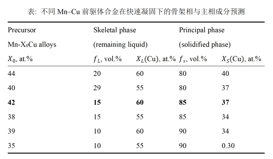 表: 不同Mn–Cu前驱体合金在快速凝固下的骨架相与主相成分预测