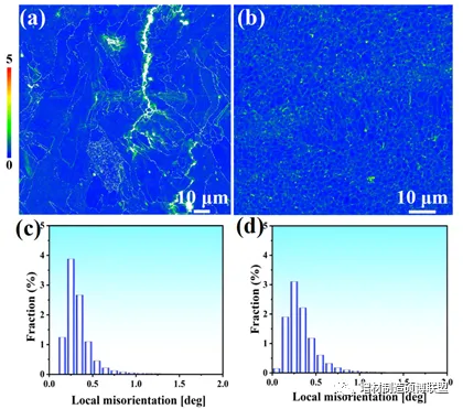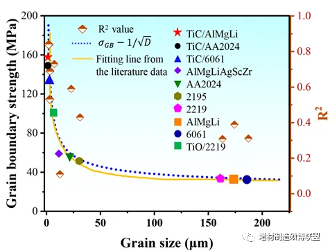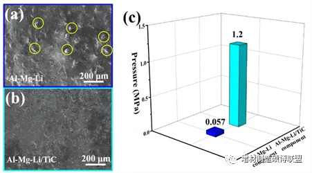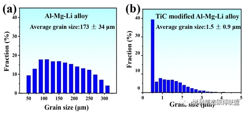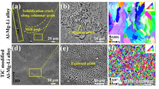 铝锂合金由于其低密度、良好的耐腐蚀性以及高强度和韧性的结合,在航空航天领域取得了成功的应用。常用的铝锂合金,包括2195、2050、2099和2199,主要通过铸造和锻造加工成薄片和试管。增材制造(AM)铝锂合金在制造仿生结构、晶格结构或其他复杂的功能/结构组件方面显示出巨大的潜力。然而,激光粉末床熔合(LPBF)加工的铝锂合金仍然面临挑战。高能束激光加工会导致铝锂合金产生严重热裂纹以及锂元素的烧蚀。 北京科技大学张百成副教授(通讯作者)等研究人员为了消除铝锂合金中的热裂纹,降低锂元素的烧损,开发了一种用于LPBF工艺的纳米陶瓷颗粒改性的新型铝锂合金。相关工作以 “Effect of lithium anti-ablation and grain refinement introduced by TiC nanoparticles in LPBF Al-Li alloy” 为题发表在《Journal of Materials Research and Technology》上。北京科技大学博士研究生孙金娥为论文第一作者,本工作获得北科大曲选辉教授指导。 熔体池中TiC纳米颗粒有效地提高了铝合金液体的粘度,减少了金属汽化和液体飞溅,从而防止了LBPF过程中Li元素烧蚀。Li含量从打印铝锂合金中的0.87 wt.%,显著提高到打印TiC改性铝锂合金中的1.34 wt. %。 此外,在铝锂合金凝固过程中,TiC纳米颗粒作为额外形核质点,促进了柱状晶向等轴晶的转化过程,极大的降低了材料热裂性,实现了全致密铝锂合金制备。在LPBF过程中,在TiC纳米颗粒表面发现了从TiC到Al3Ti的梯度转变反应,原位形成的Al3Ti相显著降低了与Al基体的晶格失配,从而使其具有优异的极限拉伸强度(343 MPa)和伸长率(9.3 %)。TiC纳米颗粒诱导的锂元素抗烧蚀作用为添加剂制造轻质合金提供了一条新的途径。本研究通过调控不同激光功率(140-10-300W)和扫描速度(60 - 400 mm/s)制备了TiC改性的Al-Mg-Li合金,图1 (a)显示了该合金的OM显微图。在扫描速度为320~400 mm/s,激光功率为200~300W时,以及扫描速度为80~400mm/s,激光功率为140~180W时合金中形成了不规则孔隙,这是由于较低的能量输入导致了不良的熔合。 此外,当扫描速度低于80mm/s,激光功率在200-300W范围内时,可以发现一些大的圆形孔隙,这些可见的冶金缺陷可以解释为过高的能量输入导致轻质元素如Al、Mg和Li的汽化。当激光功率在140~180W范围内,扫描速度在60~240 mm/s范围内时,打印TiC改性的Al-Mg-Li合金呈现几乎全致密状态,如图1 (a)中红色实线框所示。相反,打印的Al-Mg-Li合金在所有激光参数区域均形成了微小的热裂纹,如图1 (b)所示,这在LPBF打印的铝-铜合金中也发现了类似的现象。 此外,相应的相对密度结果表明,TiC改性的Al-Mg-Li合金的相对密度高于Al-Mg-Li合金。TiC改性Al-Mg-Li合金在60~240 mm/s扫描速度和140~180W激光功率下的高相对密度为99.6 %,而Al-Mg-Li合金应用工艺参数下的最高相对密度为96.1 %,这是由于严重的裂纹形成所致。因此,TiC改性Al-Mg-Li合金在宽工艺参数窗口下具有良好的LPBF打印性和有效的抗裂性。 图1 不同激光功率和扫描速度下制备的(a)合金和(b)TiC纳米颗粒改性Al-Mg-Li合金的光学显微图和相对密度 采用ICP-OES研究了相同激光加工参数(扫描速度为240mm/s,激光功率为140W)下不同状态Al-Mg-Li合金中Li元素的含量,如图2所示。结果表明,打印的TiC改性Al-Mg-Li合金的锂含量与原料粉相似。而打印的Al-Mg-Li合金中的锂含量显著降低到0.87wt.%。这是因为Li元素(342℃)的沸点比其他元素的沸点低很多,导致了高能激光束处理中Li的烧蚀。 显然,与Al-Mg-Li合金粉末和TiC改性Al-Mg-Li合金粉末中的锂含量(1.4wt.%)相比,TiC显著降低了Al-Mg-Li合金中Li的损失率,降低了56.5%,明显低于任何LPBF加工铝锂合金的研究。因此,纳米陶瓷颗粒改性是防止LPBF过程中锂元素损失的有效方法。 图2 Al-Mg-Li合金粉末、TiC纳米颗粒改性Al-Mg-Li合金粉末、LPBF打印Al-Mg-Li合金和TiC纳米颗粒改性Al-Mg-Li合金中的Li含量 选择240mm/s的LPBF扫描速度和140W激光功率下制备的Al-Mg-Li合金和TiC改性Al-Mg-Li合金试样进行扫描电镜和EBSD表征,典型的扫描电镜和EBSD微观结构特征如图3所示。如图3(a)所示,Al-Mg-Li合金呈现出LPBF打印铝合金的典型熔体池(MP)形态,即沿建筑方向(BD)的“扇形”形态。注意到,由于LPBF过程中热梯度与凝固速率的比值较高,MP内的微观结构均由粗长的柱状晶粒组成,如图3(b)所示。如图3 (c)所示,LPBF打印的Al-Mg-Li合金由具有<001>优先生长取向的柱状晶粒组成。此外,柱状晶间处可见热裂纹。 相反,TiC改性Al-Mg-Li合金的微观结构表现为随机取向的全等轴晶粒,如图3(d-f)所示。这表明TiC纳米颗粒的加入有效地消除了热裂纹。并对Al-Mg-Li合金的柱状向等轴晶粒转变起到了关键作用。 图3 LPBF打印的(a-c)Al-Mg-Li合金和(d-f)TiC纳米颗粒改性的Al-Mg-Li合金的扫描电镜图像和EBSD IPF图像 据统计,柱状晶粒的平均粒径为173±34µm(图4(a)),说明柱状晶粒在多层上沿BD外延生长(层厚设为30µm)。等轴晶粒的平均粒径约为1.5±0.9μm,比打印的Al-Mg-Li合金细化了两个数量级,如图4(b)所示。根据Liu等和Qu等的文献,在TiC纳米颗粒增强Al-Mg-Cu合金和6061合金中也发现了类似的晶粒细化现象,但这些合金的粒径在2.22μm~10.6μm之间,大于本研究中获得的1.5 μm的晶粒尺寸。这种期望的全等轴晶粒微观结构与Sc或Zr改性LPBF Al合金中发现的等轴/柱状双峰结构有显著的区别,具有显著的力学性能。 图4 打印的(a)Al-Mg-Li合金和(b) TiC改性Al-Mg-Li合金的粒径分布 图5显示了描述材料内部微观弹性应变的平均取向偏差(KAM)图。在LPBF