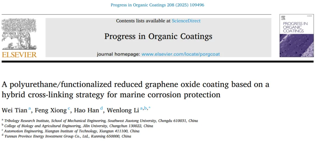 数据来源与出处 相关研究成果以“A polyurethane/functionalized reduced graphene oxide coating based on a hybrid cross-linking strategy for marine corrosion protection”为标题发表在《Progress in Organic Coatings》上。