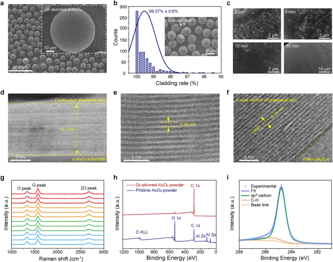 1、创新“石墨烯皮肤”: FB-CVD 精准控制,在氧化铝粉末表面生长出高结晶度、高覆盖率、批次稳定的连续石墨烯层(Gr-skinned Al₂O₃)。