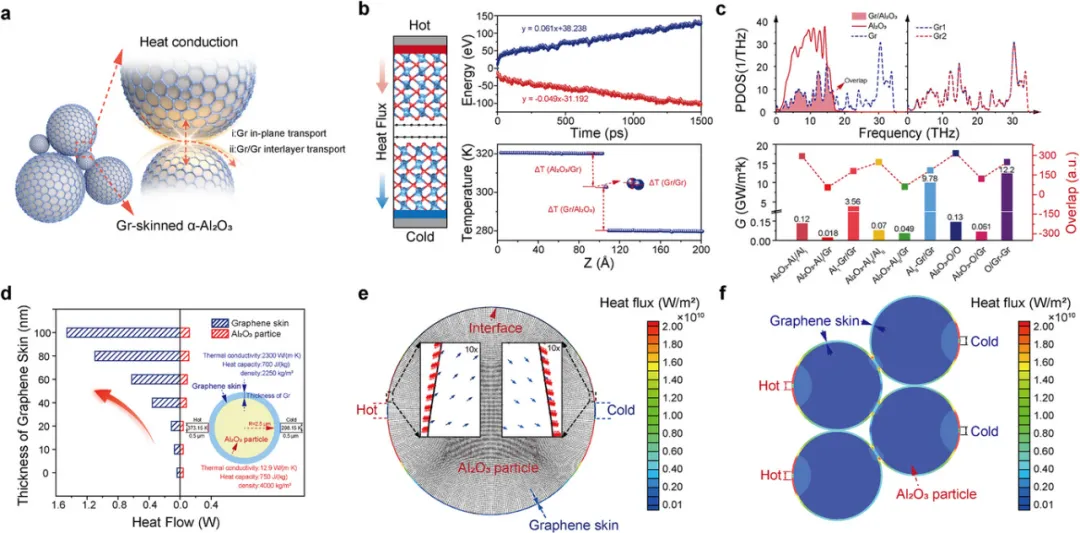 • 理论模拟 (图3): 揭示石墨烯层如何大幅提升界面热导(Gr/Gr 和 Al₂O₃-O/Gr 界面是关键)。