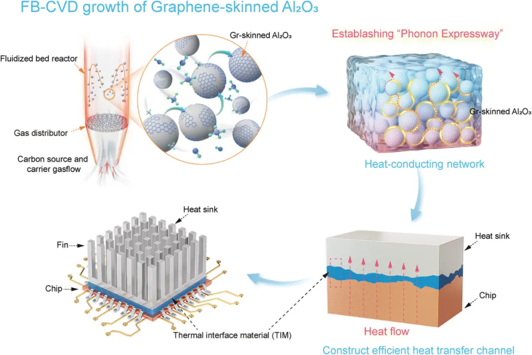 电子设备小型化、高功率化带来的散热难题如何破解?热界面材料(TIM)是关键!北京大学刘忠范院士团队在《Advanced Science》发表创新成果:利用流化床化学气相沉积(FB-CVD)技术,成功为氧化铝(Al₂O₃)粉末披上高质量、连续的石墨烯“外衣”,制备出导热性能大幅跃升的复合粉末及热界面材料。这项技术攻克了高质量石墨烯复合材料可控制备难题,为下一代电子器件散热带来新希望。