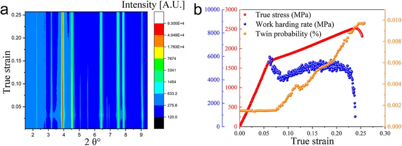 HHDP合金屈服强度1.53GPa,抗拉强度2.2GPa,均匀延伸率20%,加工硬化速率峰值6GPa,显著优于对比样与文献报道的高性能合金。原位同步辐射XRD显示,屈服后2%应变即开始出现孪生,并随形变持续演化。虽然FCC基体层错能高达66mJ/m²且临界孪生应力约2.6GPa,但异质界面处的应变梯度与位错塞积产生局部超高应力,促使形变孪生发生。