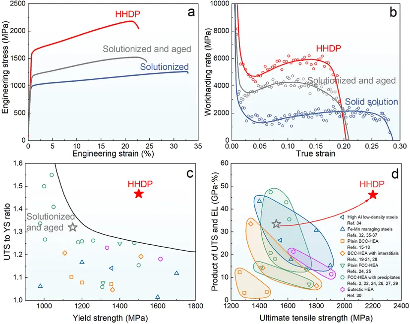在结构金属材料的应用环境中,强度和塑性都是决定某一种合金体系应用场景的重要参考性能,在体系优化的策略上也往往注重于提高合金的这两种性能,但在很多情况下,在优化材料力学性能时要面临“强-塑”权衡,尤其是在屈服强度超过1.5GPa时,由于位错累积受限,往往导致塑性不稳定和早期失效。传统通过形变孪生(TWIP效应)提升加工硬化的策略,通常局限于低层错能材料,而其屈服强度难以超过1GPa;而高强析出强化材料的高层错能又会抑制孪生形成。因此,研究人员们一直在追求如何实现当合金实现超高强度的同时获得优异的加工硬化能力和塑性。