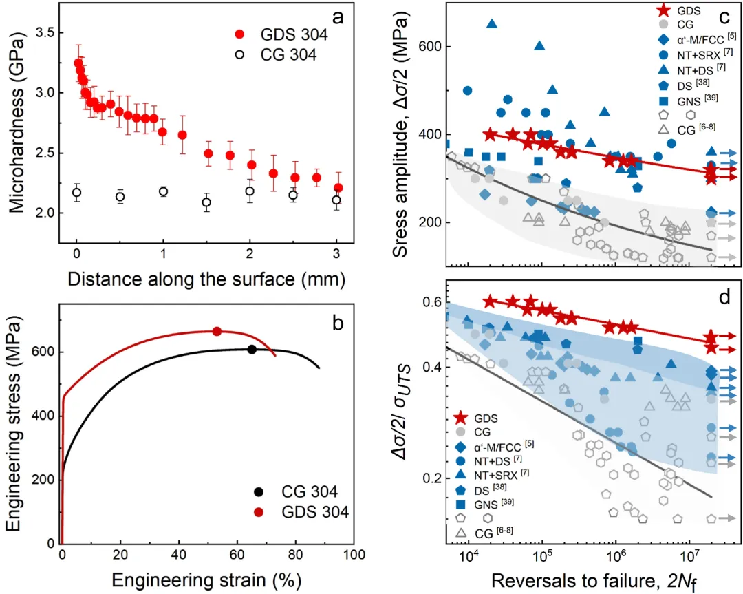相比粗晶态(CG 304 SS),GDS 304 SS与CG的236±3MPa和610±2MPa相比,GDS 304 SS的屈服强度和极限抗拉强度显著提高到了466±2MPa和664±12MPa,屈服强度提升约一倍,疲劳寿命在相同应力幅下提高至少一个数量级,且疲劳极限接近纳米结构的304不锈钢,但GDS 304 SS的这一提升没有损失材料的塑性,保持着较高的55±1%均匀伸长率。