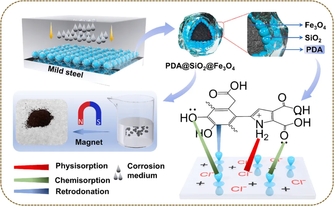 防腐及回收机制示意图 PDA@SiO2@Fe3O4的防腐及回收机制示意图。