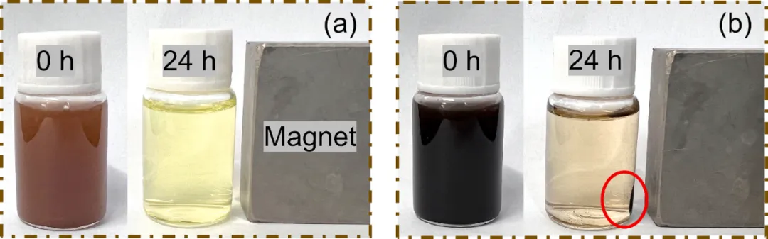 回收性能 (a)Fe3O4 MNPs和(b)PDA@SiO2@Fe3O4 MNPs的回收性能。