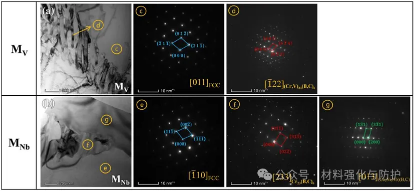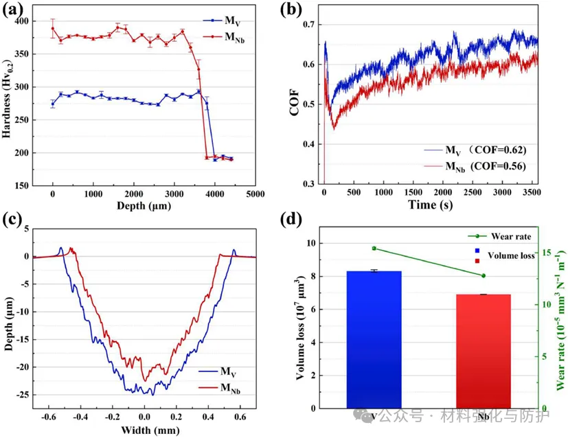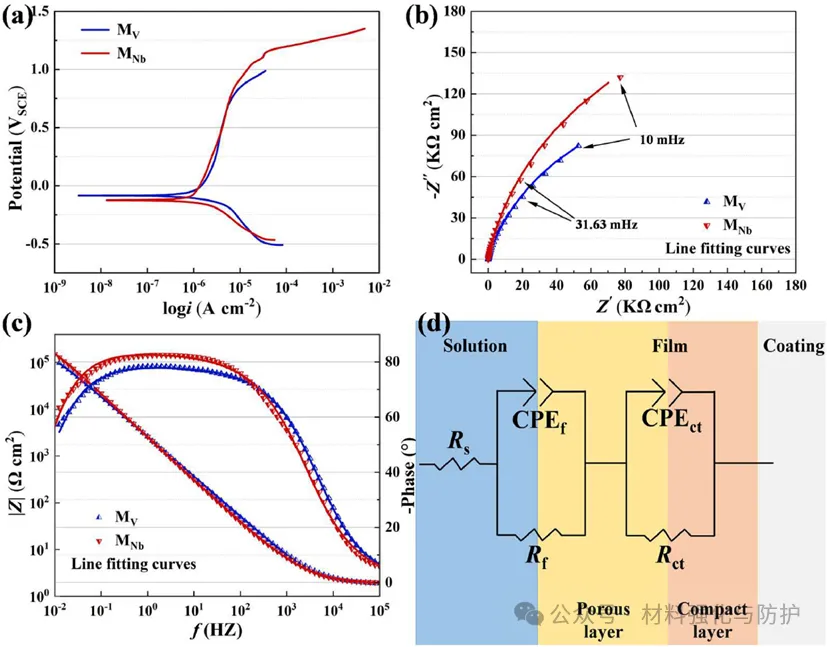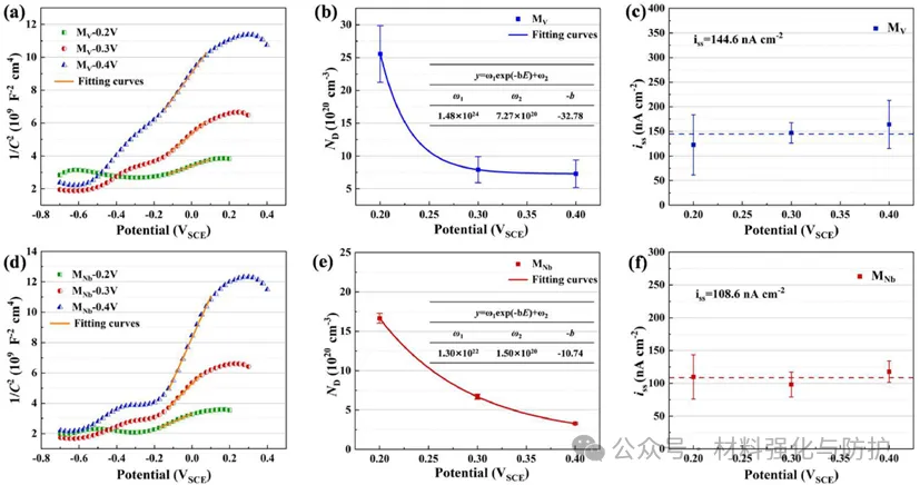 在海洋环境中长期服役的工程应用装备材料经常会承受着磨损和腐蚀的协同作用,导致材料的损伤或者失效,这种磨损和腐蚀的耦合影响远远超过了单个因素对材料的累积效应。因此,耐蚀与耐磨一体化材料的开发对于延长海洋工程系统中材料的使用寿命并确保其安全运行是至关重要的。但传统合金在提高耐磨性和耐腐蚀性的协同方面往往面临着重大挑战,这使工程应用上迫切地需要开发出新型耐磨蚀一体化的材料。 近日,中国海洋大学和山东科技大学的崔洪芝教授团队与中南大学粉末冶金国家重点实验室研究团队通过激光熔覆技术制备出了(CoCrNi)87M8B4C(M: V/Nb)复合涂层,他们通过界面调控结合高熵合金(HEAs)的特征成分,并结合共格界面设计和高固溶度陶瓷增强涂层性能,所制备出的含Nb的涂层磨损率为1.28×104mm3N-1m-1,显著提高了涂层的耐磨性。且两种涂层在腐蚀环境中都可以形成稳定的钝化膜,这为发展耐磨耐蚀材料提供了一种新的策略。该研究结果于2025年6月29日在国际期刊《Journal of Materials Science & Technology》上被接收。 【核心内容】 崔洪芝教授团队采用激光熔覆技术制备出的两种复合涂层同时增强了合金的耐腐蚀性和耐磨性,这种涂层的设计和制备侧重于陶瓷增强相的原位生成、钝化能力和微电偶腐蚀性能。其中含Nb涂层形成双相强化结构,磨损率仅为1.28×104mm3N−1 m−1。在腐蚀方面,含V和含Nb涂层的腐蚀电流密度分别为178nAcm−2和182nAcm−2,腐蚀导致了含Nb涂层在干摩擦和摩擦腐蚀条件下具有不同的磨损机理。 图形摘要 【研究方法】 该研究以CoCrNi体系为基础,采用激光熔覆技术制备(CoCrNi)87M8B4C(M:V/Nb)复合涂层,两种涂层分别命名为MV和MNb,并采用动电位极化(Tafel)、恒电位极化、电化学阻抗谱(EIS)和莫特-肖特基(M-S)分析来评估涂层的电化学行为。另外采用扫描开尔文探针显微镜(SKPFM)分析了不同相的功函数(WFs)特性,从热力学和热力学两个角度分析了涂层的腐蚀机理。 【研究成果】 ① 涂层的微观组织 两种涂层都呈现出了枝晶状微观组织,在相形成方面,MV涂层是由FCC基体相和(Cr,V)23(B,C)6强化相组成,具有纳米级层状共晶结构,层间距约为200nm,而MNb涂层是FCC基体相、Cr23(B,C)6相和(Co,Ni,Nb)(B,C)相的三相共存结构,枝晶间区域呈块状共晶结构,其晶粒尺寸更小且枝晶间区域更大。此外,两种涂层的强化相均与基体形成了良好的界面结合,其中MV中FCC相与(Cr,V)23(B,C)6相存在相干界面,而MNb中存在非晶区域,有效降低了界面能。 涂层的微观结构和EDS谱:(a) MV和(b) MNb 涂层的TEM图像和SAED结果:(a) MV和(b) MNb ② 涂层耐腐蚀性能及其机制 MV和MNb涂层在3.5wt.%NaCl溶液中都可以自发钝化,腐蚀电流密度分别为178和182nA・cm-2且无点蚀现象。其中MNb涂层的耐蚀性更好且钝化膜更厚,具有1.45MV・cm-1的内电场强度,相比于MV的1.02MV・cm-1更高。MNb涂层膜/溶液界面电位差更低,钝化膜溶解速率更慢,表现出更优的耐蚀性。相干相界面和高固溶强化相减少了相间成分差异和电偶腐蚀,促进了均匀钝化膜的形成,低相间电位差和高原子堆积密度进一步抑制了腐蚀的发生。 (a) 动电位极化曲线, (b) 相应的奈奎斯特图, (c) Bode图, (d)等效电路 (a, d) MV和MNb涂层在不同电位下的Mott-Schottky图, (b, e) 施主密度和形成电势之间的关系的曲线, (c, f) 不同电位下的准稳态电流密度 ③ 涂层的耐磨性及其机制 MNb涂层的平均硬度为377HV0.2,与MV涂层的283HV0.2相比更高。MV涂层以粘着磨损为主,表面有明显分层和磨屑堆积,MNb涂层以磨粒磨损为主,表面更光滑,分层区域显著减少。纳米级层状共晶结构缓解了相间应力集中,延迟了磨损过程中表面裂纹的萌生,强化相的均匀分布和界面强结合(相干界面、非晶区域)进一步提升了抗磨损能力。 (a) 沿着涂层深度的显微硬度, (b)磨损率, (c) 磨损截面轮廓, (d)磨损体积损失和磨损率 (a) 摩蚀试验中的OCP和COF, (b) 磨损体积损失, (c) 磨损截面轮廓 磨损形貌及面扫分析 性能对比图 【总结与展望】