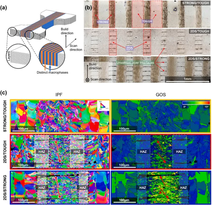 图3.(a)变形金属拉伸试棒的示意图。不同的宏观相用蓝色和橙子表示。(b)光学显微照片显示了STRONG/坚韧,/2DS/坚韧,2DS/化学蚀刻样品以显示每个宏观相的不同微观结构。为每个样品设计和制造了总共15个交替的宏观相区。c)三种宏观相组合的EBSD IPF和晶粒取向扩展(GOS)图,显示了热影响区(HAZ)对2DS位错密度的影响。红色箭头指向2DS宏观相中未焊接板之间的间隙。