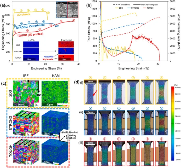 图2.(a)2DS、STRONG和坚韧宏观相的工程应力-应变曲线。(顶部插图)STRONG单个熔池的光学显微照片(蓝色轮廓)和坚韧(红色轮廓)。(底部插图)未变形和断裂样品的相位图,表示由于拉伸载荷而发生的相变(如果有的话)。(b)真应力-真应变曲线(虚线)和相应的加工硬化率曲线(实线)为强,坚韧,和2DS宏观相。这些曲线突出了三种试样类型之间的力学响应和加工硬化行为的差异。使用窗口大小为2的移动平均值平滑加工硬化速率曲线,以减少噪声并提高趋势的清晰度。c)2DS的电子背散射衍射(EBSD)反极图(IPF)图和核平均取向差(KAM)图,坚韧和STRONG样品在3个不同的轴上表征,而2DS只能在2个轴上表征-其轧制方向(RD)和横向(TD)。强和坚韧的IPF图中的黑色箭头指的是激光扫描方向。(d)(i)2DS的数字图像相关(DIC)快照,1(b)中标记的不同菌株的(ii)强和(iii)坚韧。(i)中的红色箭头表示2DS中菌株定位的起始。